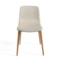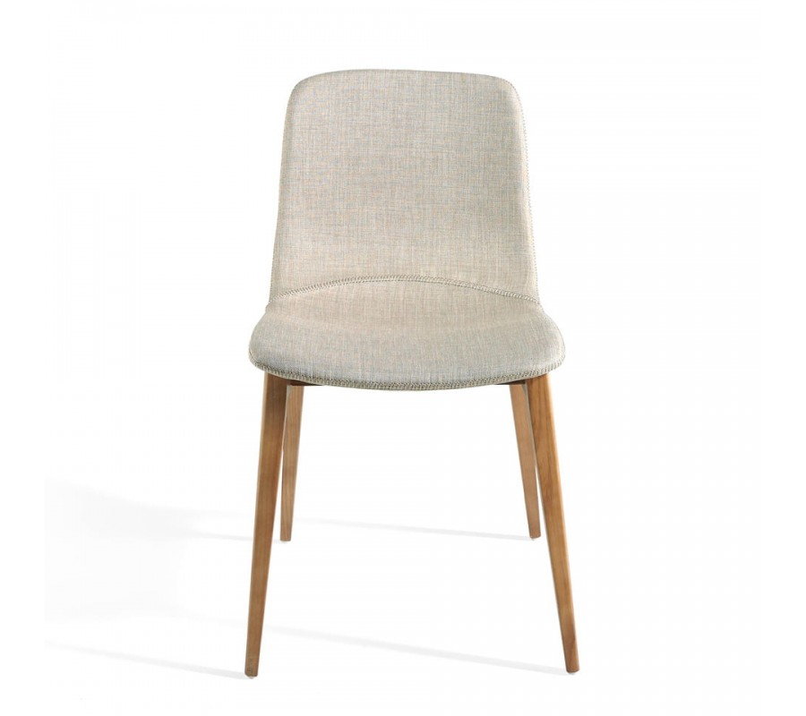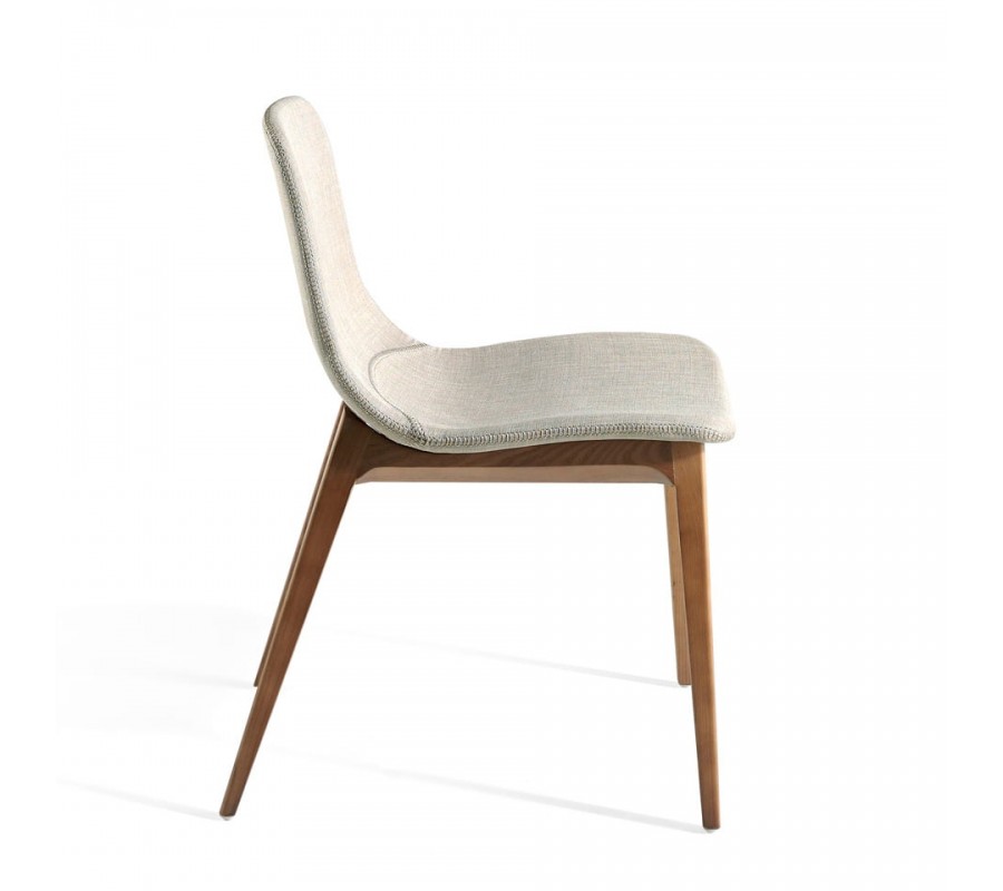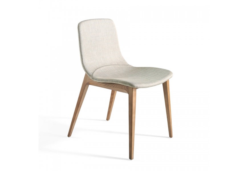 Moderná jedálenská stolička Forma Moderna Vám ponúka textilné čalúnenie v krémovo bielej až béžovej farbe, ktoré je obohatené o jemné dizajnové prešívanie po obvode sedadla a na sedacej časti. Krémové čalúnenie je doplnené konštrukciou a nožičkami z masívneho jaseňového dreva v bledohnedej farbe, ktoré krásne vynikne s farebným prevedením čalúnenia.