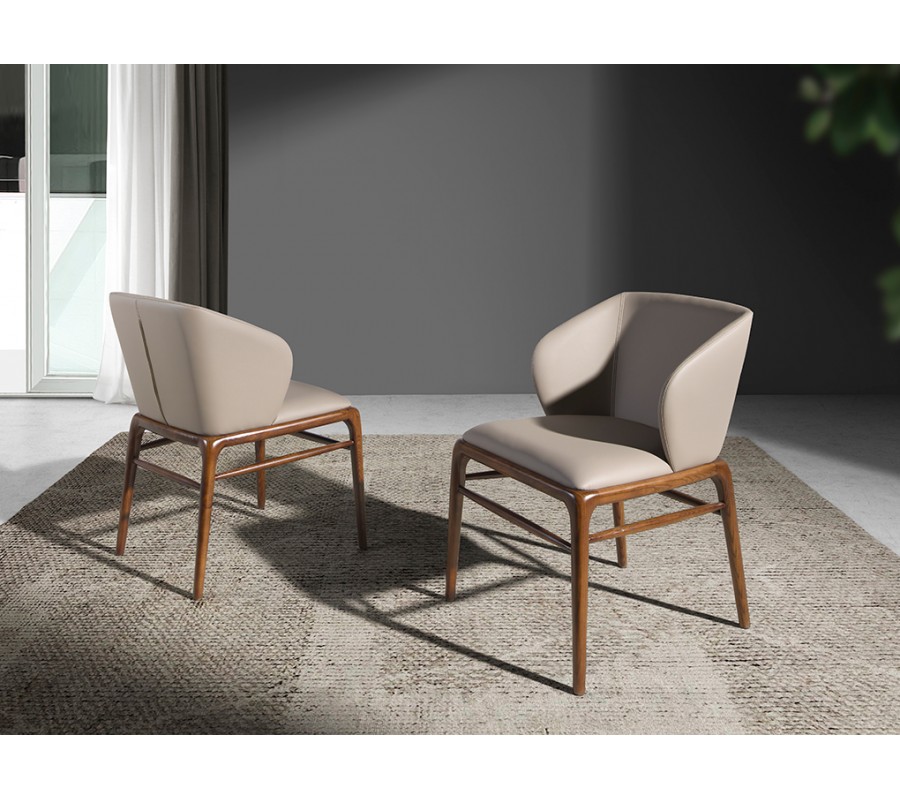 Koženková jedálenská stolička Forma Moderna je dokonalým kúskom na kombináciu s moderným nábytkom, najmä s jedálenskými stolmi zo skla s drevenými nožičkami. Jej kombinácia koženky vo farbe norky a orechového dreva vytvára jedinečný a elegantný moderný nábytok, ktorý prinesie do Vášho priestoru teplo a sofistikovanosť.