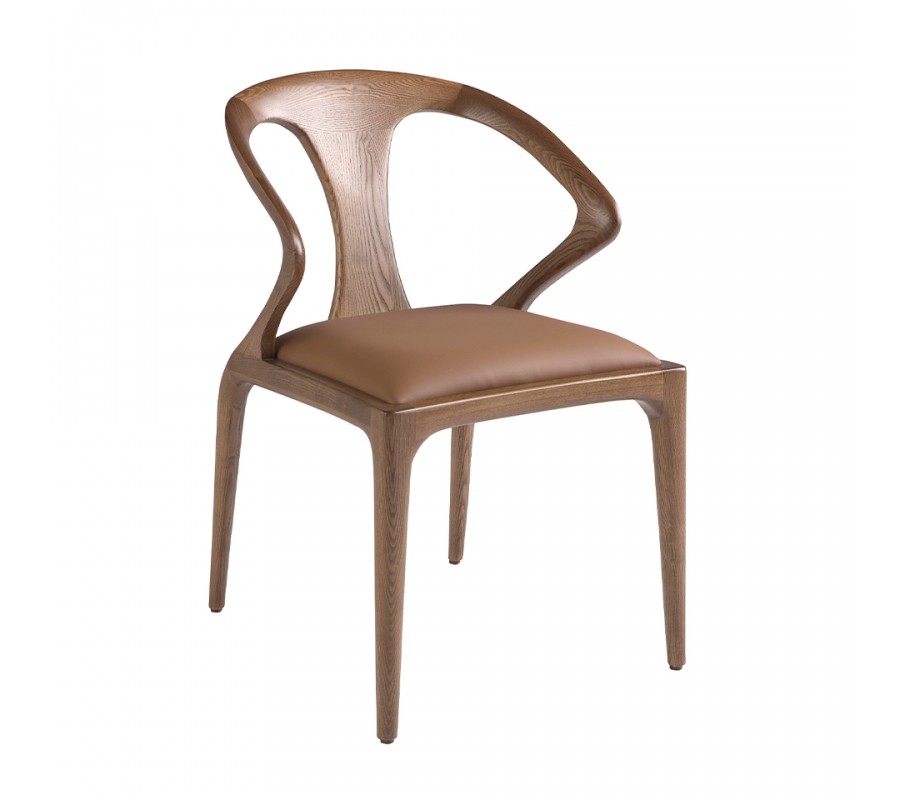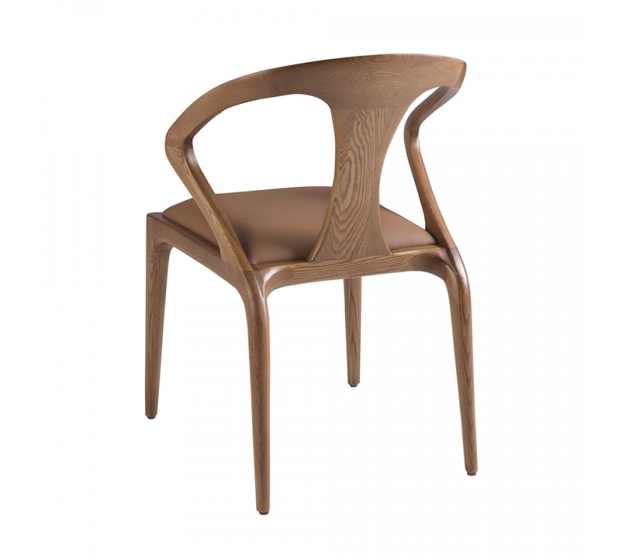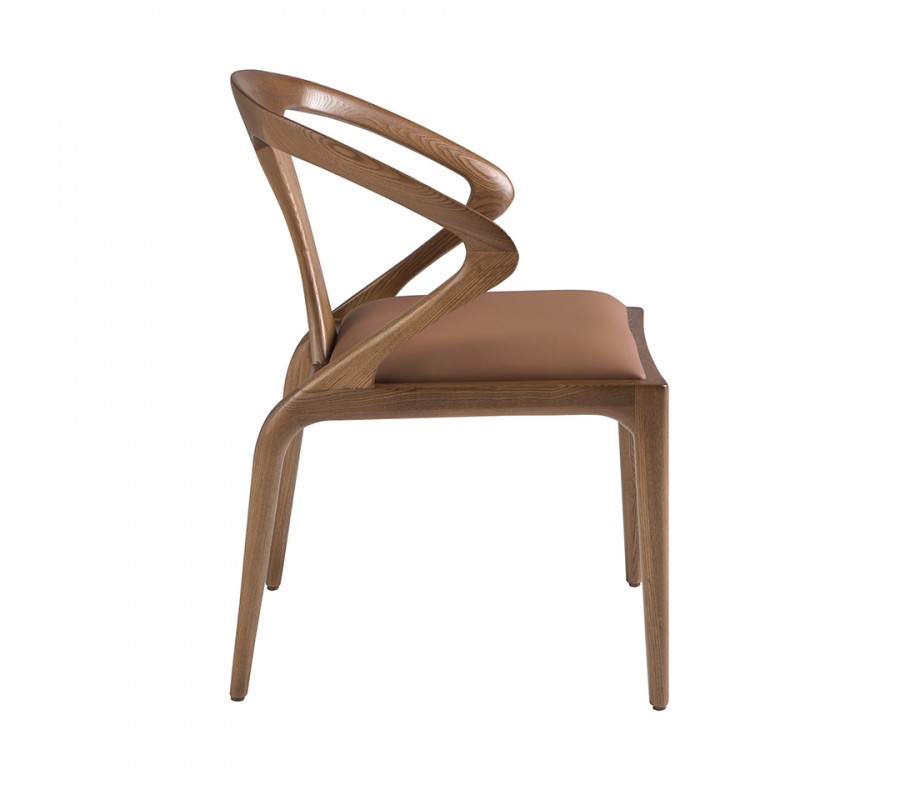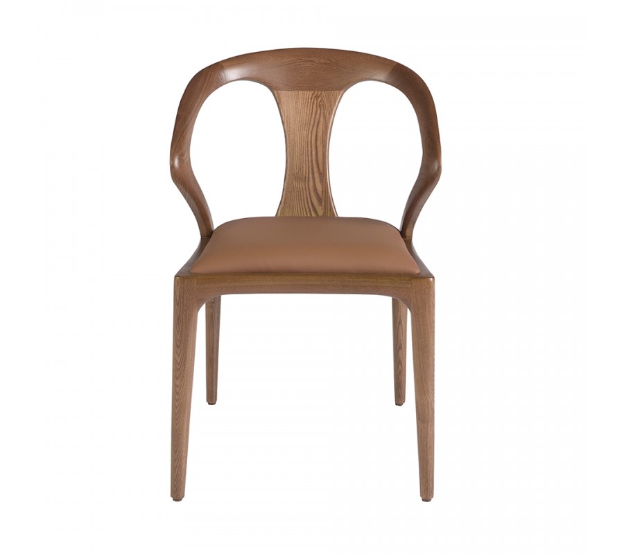 Silueta stoličky kombinuje jednoduché rovné línie a elegantné krivky. Sedacia časť má obdĺžnikový tvar. V drevenom ráme je umiestnený čalúnený sedací vankúš s poťahom z ekokože. Predné nožičky sú rovné a smerom nadol sa jemne zužujú. Na bočnej strane sa pripájajú k sedacej časti v miernej krivke. Dynamický prvok prináša do dizajnu zaoblená chrbtová opierka, ktorá sa na bočných stranách láme v ostrom uhle a vizuálne prechádza do línií zadných nožičiek.