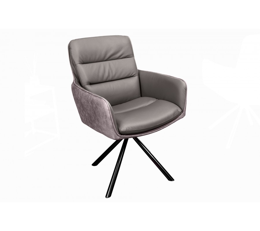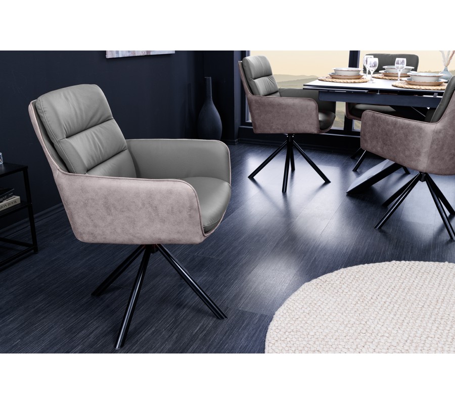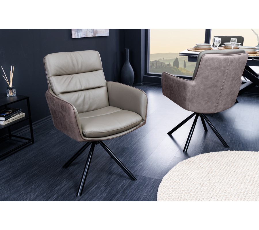 Otočná stolička Coiro na prvý pohľad zaujme svojim čistým moderným dizajnom. Na sedacej a chrbtovej časti sa nachádza čalúnenie z pravej kože v šedej farbe. Rovnaký materiál nájdete aj na vnútornej strane opierok na ruky. Vonkajšia strana je pokrytá poťahom z mikrovlákna v tmavšom šedom odtieni. Obe tieto farby sa označujú ako taupe - ide o zmes odtieňov sivej a béžovej, ktoré pôsobia decentným elegantným dojmom. Kombinácia viacerých odtieňov taupe dizajn ozvláštni, no stolička stále pôsobí neutrálne, čo vám poskytuje široké možnosti pri zariaďovaní. Šikmé nožičky sú z kovu s čiernym matným nástrekom. Stoličku tak môžete doplniť nábytkom s podobnými kovovými prvkami, čím dodáte vášmu priestoru moderný industriálny štýl. Vhodná je tiež kombinácia s neutrálnymi odtieňmi ako šedá, béžová, čierna či biela. Miestnosť môžete ešte oživiť zelenými rastlinami. Stoličku Coiro môžete okrem obývačky umiestniť napríklad aj do pracovne alebo spálne, kde vďaka svojmu masívnejšiemu dizajnu posúži aj ako kreslo. Pohodlie vám zaručí sedacia plocha vo veľkosti 44x44 cm a opierky na ruky s výškou 26 cm. Maximálna nosnosť je 120 kg.