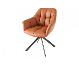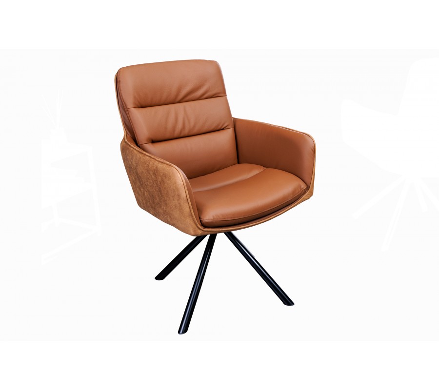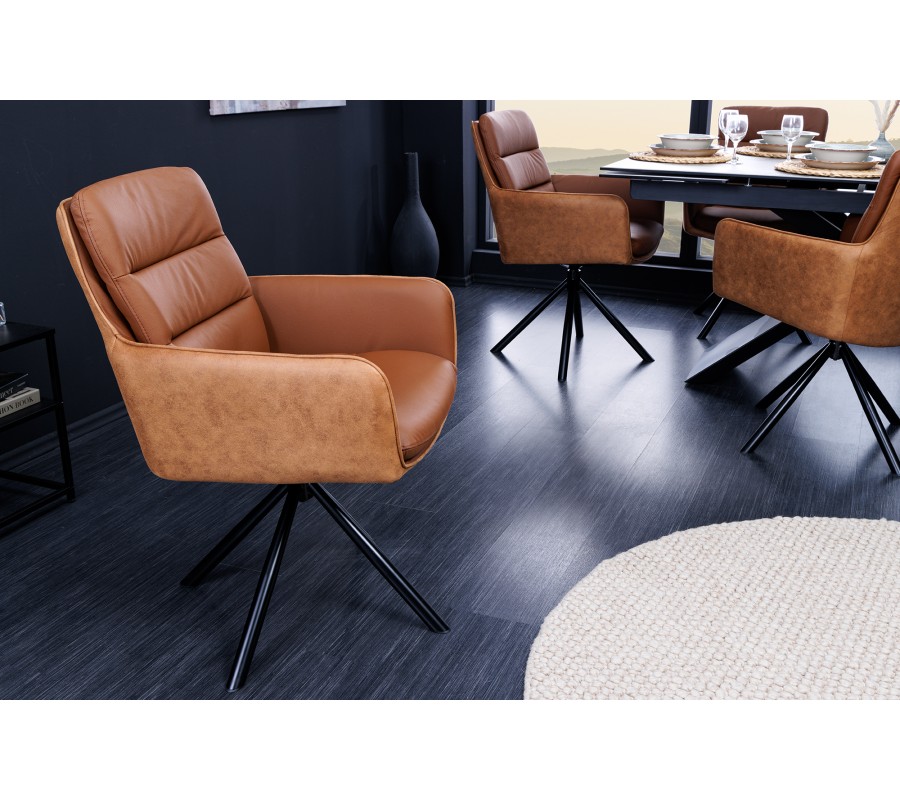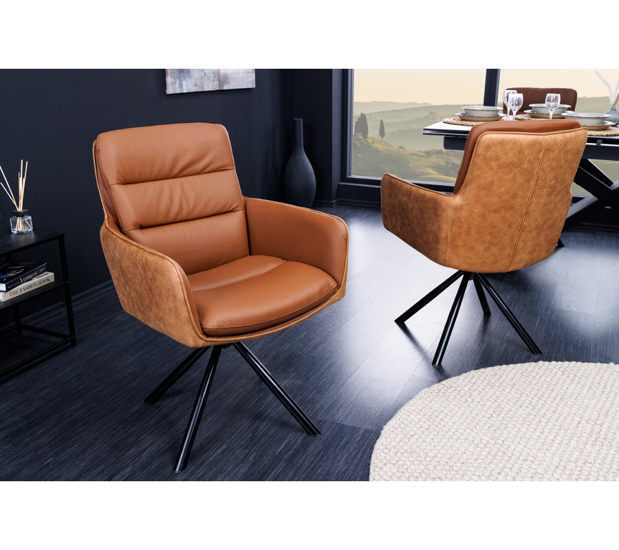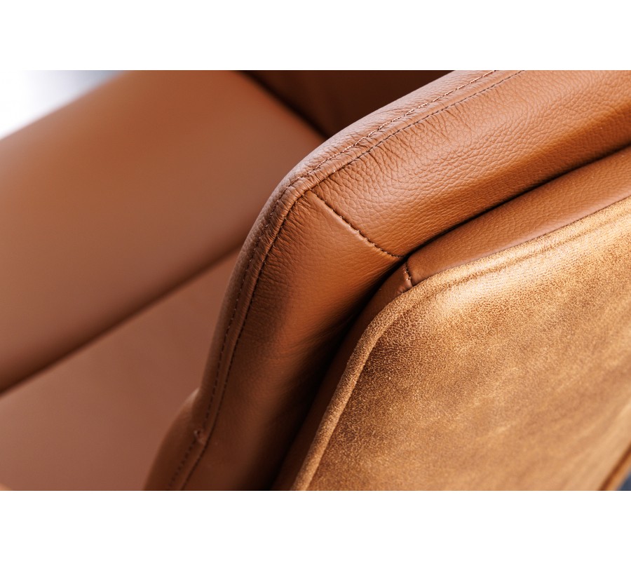 Moderná industriálna stolička Coiro vás okamžite upúta krásnou koňakovou hnedou farbou čalúnenia z pravej kože. Poťah na vonkajšej strane stoličky je z mikrovlákna, ktoré taktiež vytvára ilúziu kože. Tento rozdiel v štruktúre dodáva stoličke elegantný a nadčasový dizajn, ktorý je ešte prehĺbený jednoduchým lineárnym prešívaním na opierke chrbta. Kovové nožičky sú upravené čiernym matným nástrekom. Stoličku tak môžete prepojiť s nábytkom s podobnými prvkami. Do jedálne či pracovne v industriálnom štýle tak prostredníctvom koňakovej farby poťahu vnesiete teplo domova. Stoličku môžete umiestniť aj do pracovne, kde vnesie nádych distingvovanosti. Vďaka svojmu masívnejšiemu dizajnu ju môžete využiť aj ako kreslo. Farebne sú vhodné doplnky a textílie v neutrálnych teplých farbách, ako napríklad béžová, či svetlo hnedá, ale aj naturálne drevené povrchy. Drevo a koža vytvoria vo vašej domácnosti prírodnú harmóniu, ktorú môžete ešte doplniť živými rastlinami. Pohodlie vám zaručí sedacia plocha vo veľkosti 44x44 cm a opierky na ruky s výškou 26 cm. Kreslo má maximálnu nosnosť 120 kg.