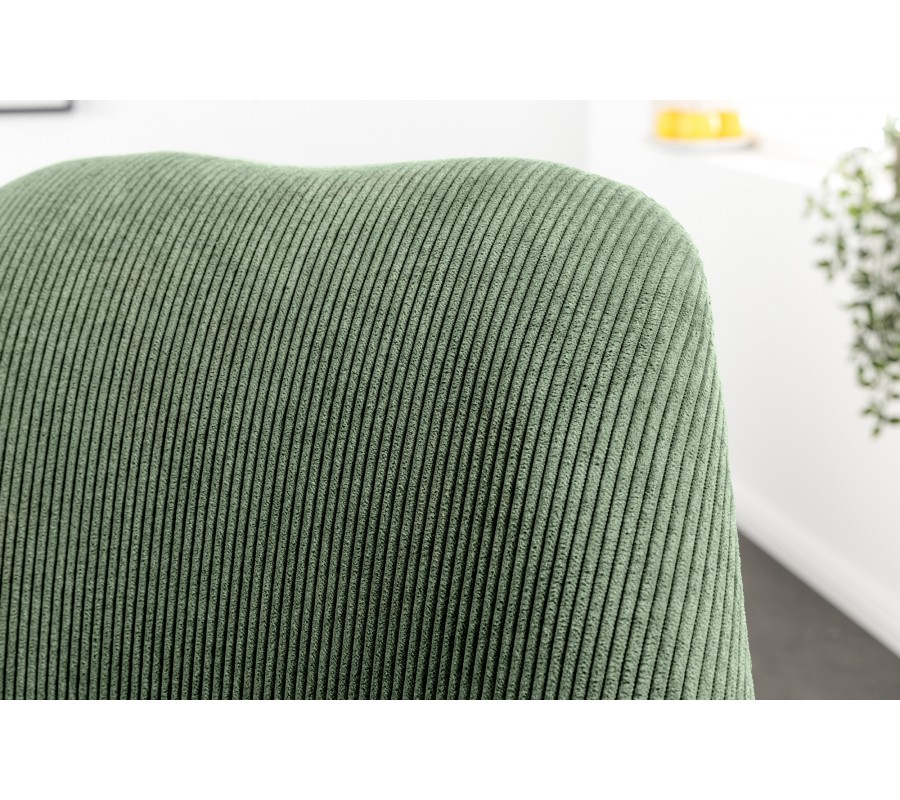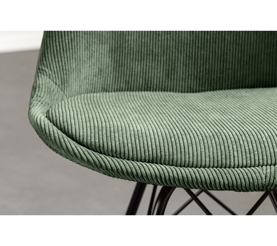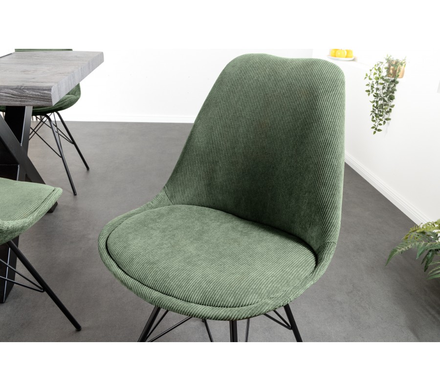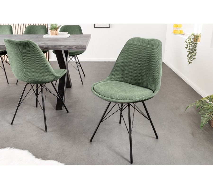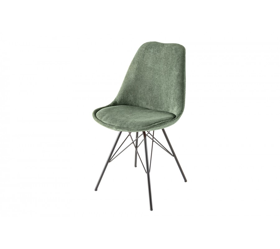 Dizajnová moderná stolička Scandinavia zaujme čistým a minimalistickým dizajnom typickým pre škandinávsky štýl, ktorý výborne dopĺňa menčestrové čalúnenie v tmavozelenej farbe so šalviovými odtieňmi. Pastelové odtiene sa hodia do jedálne vo svetlých prírodných farbách a dodajú vášmu domovu skutočný štýl severských domčekov. Stoličku môžete skombinovať tiež s nábytkom v industriálnom štýle, vďaka kovovým nožičkám s čiernym práškovým nástrekom. Pri jedálenskom stole s podobnými čiernymi kovovými detailami skutočne vyniknú nádherné pastelové šalviové odtiene čalúnenia. Pohodlie Vám zaručí chrbtová opierka vysoká 42 cm a sedacia časť s rozmerom 45x40 cm vo výške sedu 49 cm. Stolička má nosnosť 120 kg.