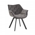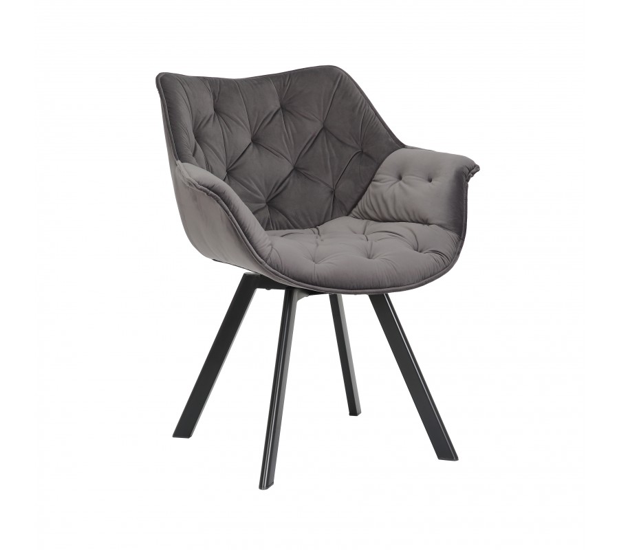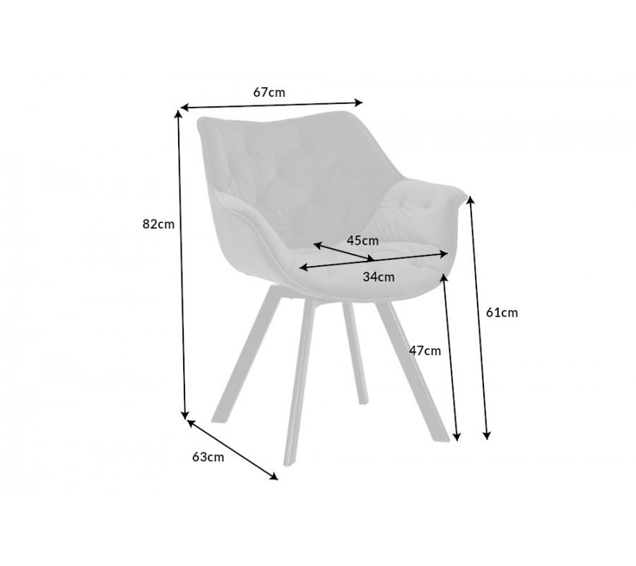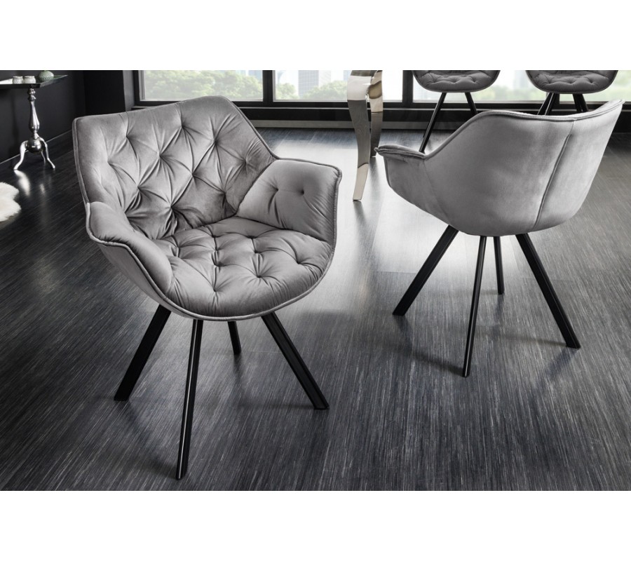Otočná stolička Hetty prinesie do vašej domácnosti kráľovský luxus. Čalúnenie v elegantnej striebornej sivej farbe je ozdobené hlbokým bodovým prešívaním pripomínajúcim chesterfield štýl, ktoré vytvára na poťahu diamantový vzor a zároveň aj vizuálne zdôrazňuje mäkkosť a pohodlnosť sedacej časti. K vášmu absolútnemu komfortu prispieva aj zamatové čalúnenie, ktoré je príjemné na dotyk. Je vyrobené z mikrovlákna, takže je veľmi odolné a nevyžaduje náročnú údržbu. Pod sedacou časťou sa nachádza mechanizmus, ktorý umožňuje jej otočenie o 180°, vďaka čomu môžete stoličku používať aj ako kancelárske kreslo. Kovové nožičky sú mierne zošikmené a pokryté čiernym práškovým nástrekom, ktorý im dodáva matný vzhľad. Stolička je preto vhodná aj do priestorov zariadených v industriálnom štýle, kde ju môžete skombinovať s nábytkom s podobnými kovovými prvkami. Skvele doplní aj jedálenský stôl z materiálov ako sklo, mramor alebo chrómované povrchy. Miesto si nájde aj v modernej obývačke, kde môže mať vďaka svojmu masívnemu tvaru funkciu kresla.