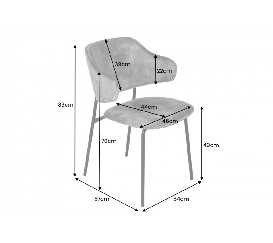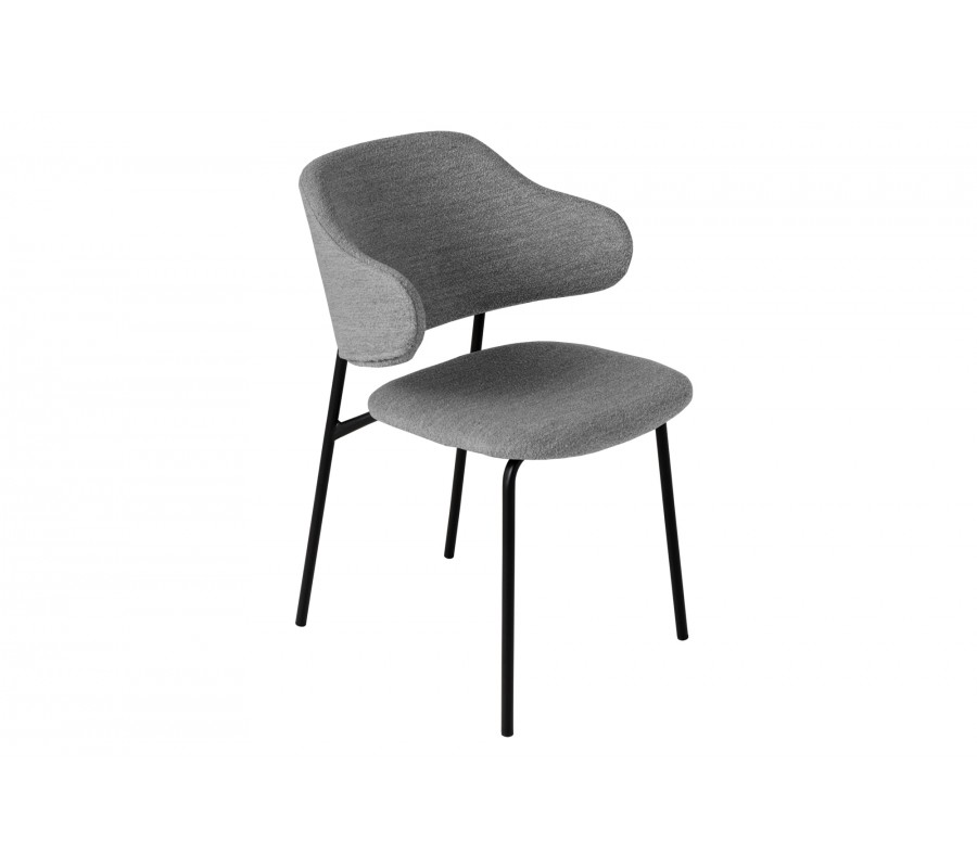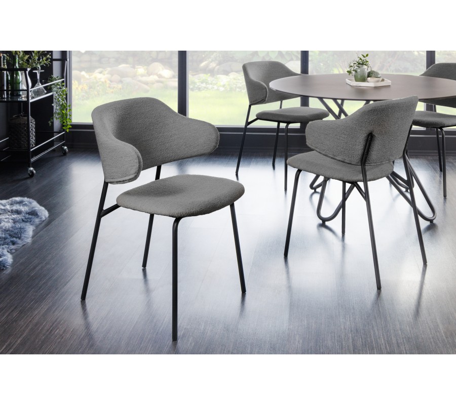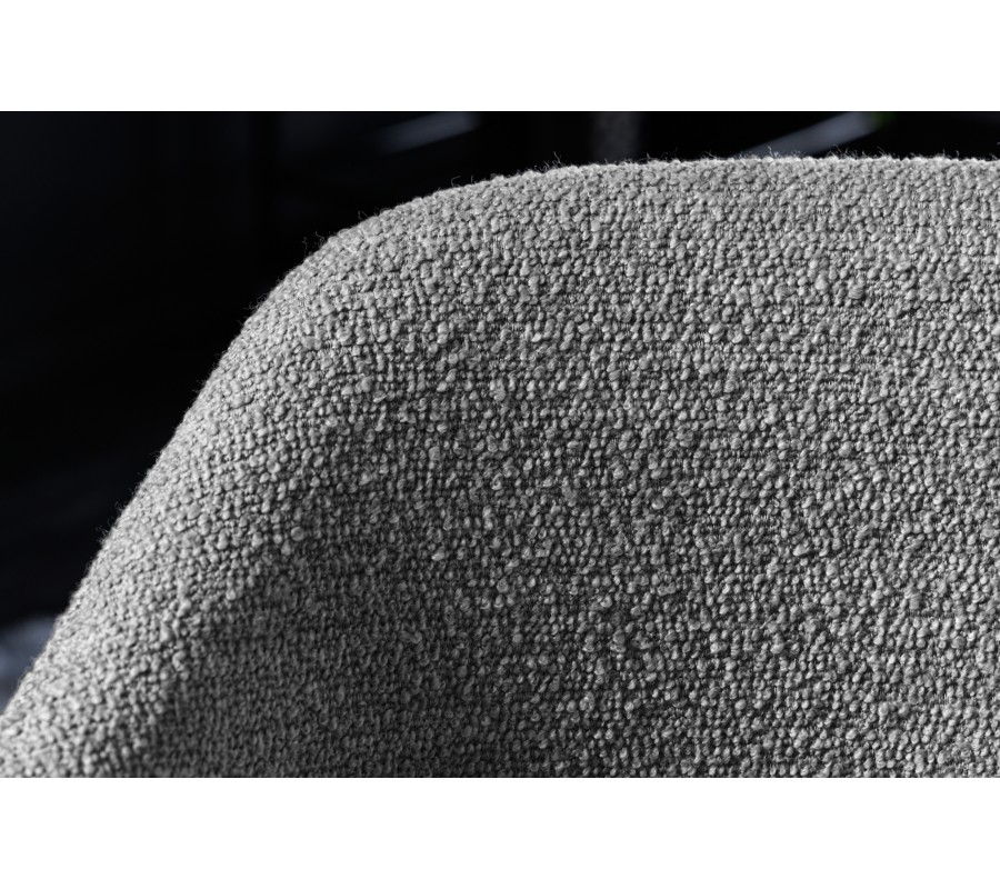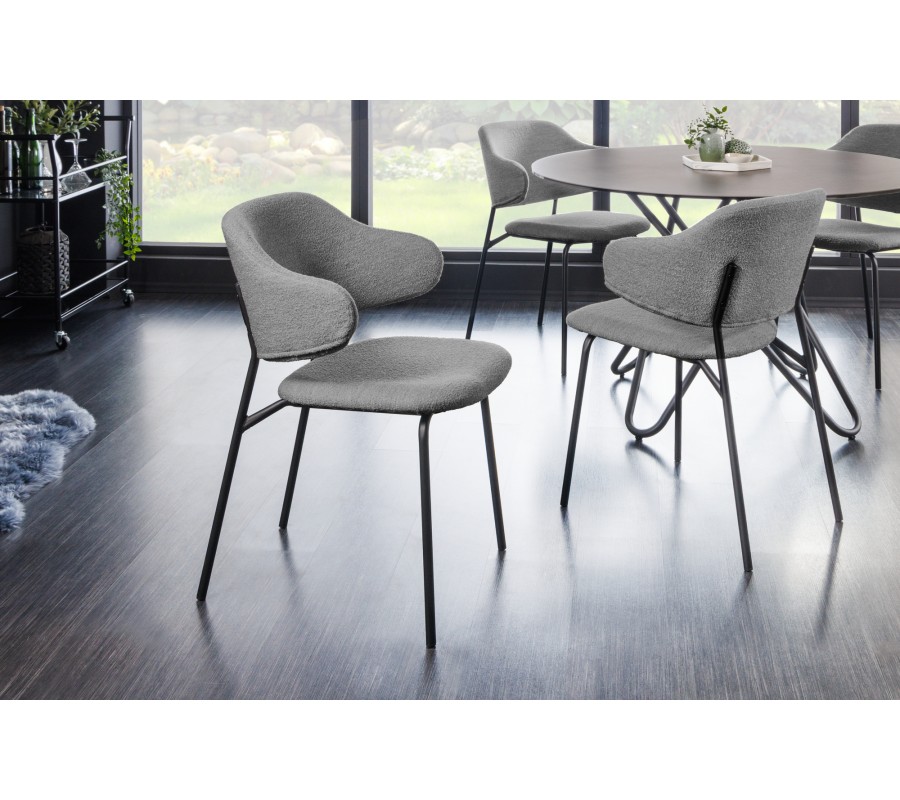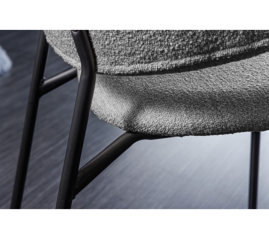 Jedálenská stolička Mildred v sebe spája moderný dizajn a maximálny komfort. Poťah je zhotovený z buklé látky, ktorá je príjemná na dotyk. Hrubšia štruktúra jej dodáva mäkkosť a zároveň je zaujímavým vizuálnym prvkom v inak jednoduchej siluete tohto nábytku. Pohodlné opretie pre chrbát a ruky vám zaručí zaoblená opierka upevnená na dvoch predĺženiach zadných nožičiek. Sivá farba čalúnenia pôsobí elegantným a sofistikovaným dojmom. Výborne ladí s matnými čiernymi nožičkami, ktoré sú vyrobené z kovu a prinášajú do tohto dizajnu nádych industrializmu. Tie zároveň vytvárajú príjemný estetický kontrast s mäkkým poťahom. Stolička sa hodí do moderných priestorov zariadených v neutrálnych odtieňoch sivej, ktoré ozvláštni svojou štruktúrou a zároveň vám pomôže vytvoriť nadčasový vzhľad. Môžete ju tiež doplniť do jedálne zariadenej v industriálnom štýle k jedálenskému stolu či príborníku s čiernymi kovovými prvkami podobnými nožičkám.