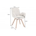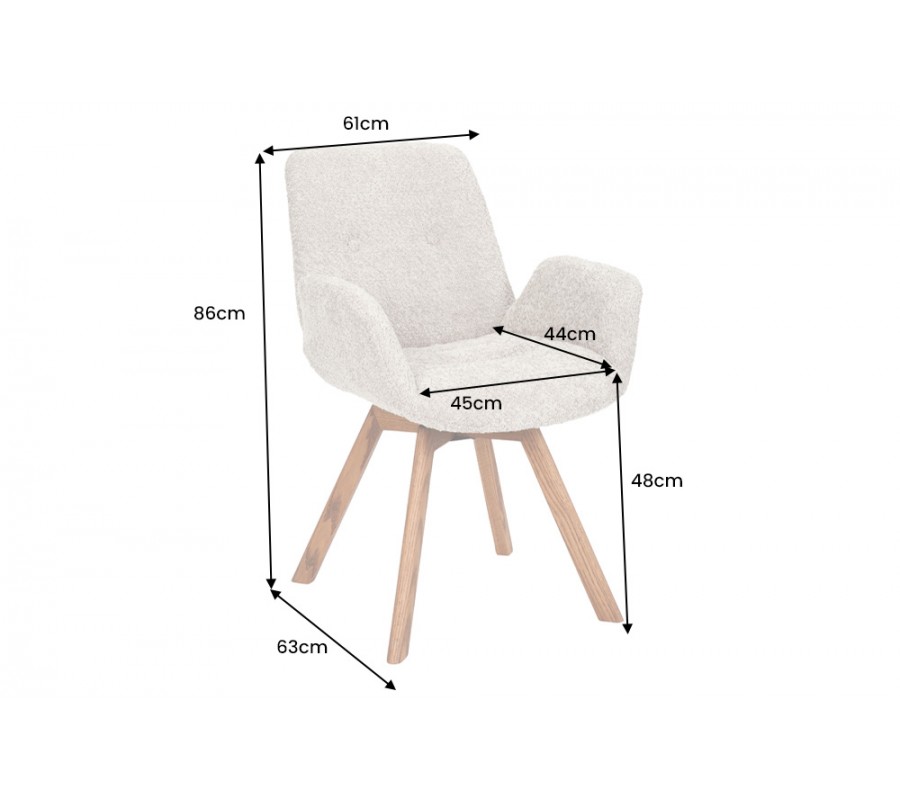 Moderná škandinávska stolička Gothenborg vyžaruje pocit tepla a útulnosti. Je to najmä vďaka svetlému béžovému poťahu z buklé látky, ktorá dodáva dizajnu zaujímavú štruktúru a mäkkosť. K dosiahnutiu maximálneho komfortu napomáhajú aj zaoblené opierky na ruky a vysoká chrbtová opierka. Silueta stoličky je jednoduché a prevládajú v nej rovné línie a jemné krivky. Minimalistické zdobenie pozostáva z dvoch okrúhlych gombíkov na chrbtovej opierke a lineárneho prešitia na sedacej časti. Mierne zošikmené nožičky pokračujú v naturálnej tendencii farieb. Sú vyrobené z jaseňového dreva v príjemnej teplej medovo hnedej. Svetlé odtiene robia z jedálenskej stoličky Gothenborg ideálny doplnok do priestorov zariadených v škandinávskom štýle, kde ju môžete doplniť moderným lineárnym nábytkom a taktiež výraznými farebnými dekoráciami a textíliami. Hodí sa tiež k jedálenskému stolu z masívneho dreva, kde vynikne jej prírodný charakter a zároveň vytvorí svojím čalúnením zaujímavú kombináciu štruktúr. Vďaka opierkam, ktoré jej dodávajú masívny vzhľad, ju môžete tiež umiestniť do menších obývacích priestorov, kde zastúpi funkciu kresla, alebo do spálne či pracovne ako akcentový prvok. Stolička Gothenborg dodá vašim priestorom príjemné miesto na pohodlné posedenie a zároveň ich oživí svojím jedinečným a útulným dizajnom.