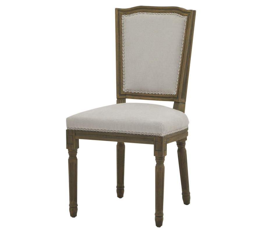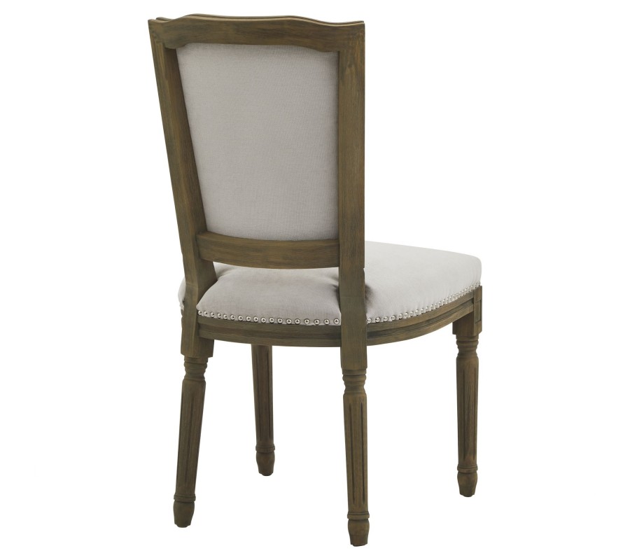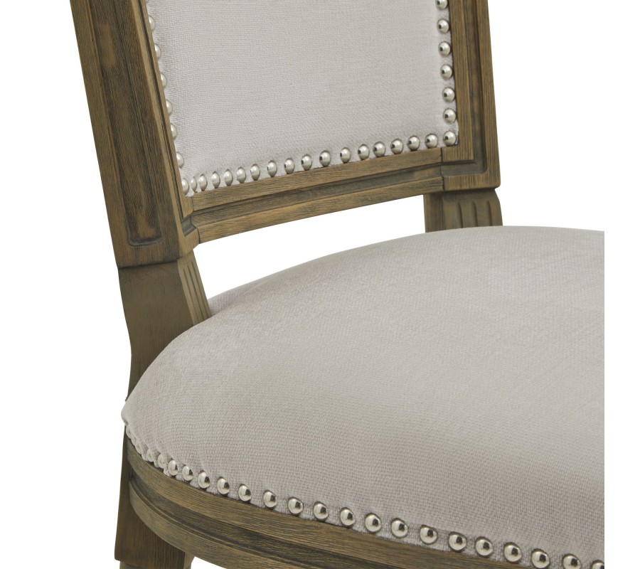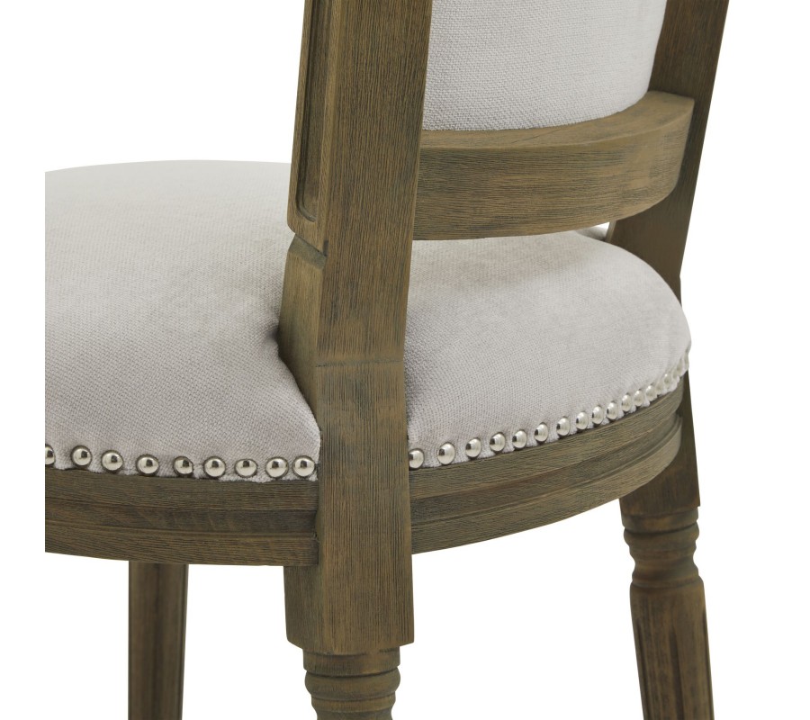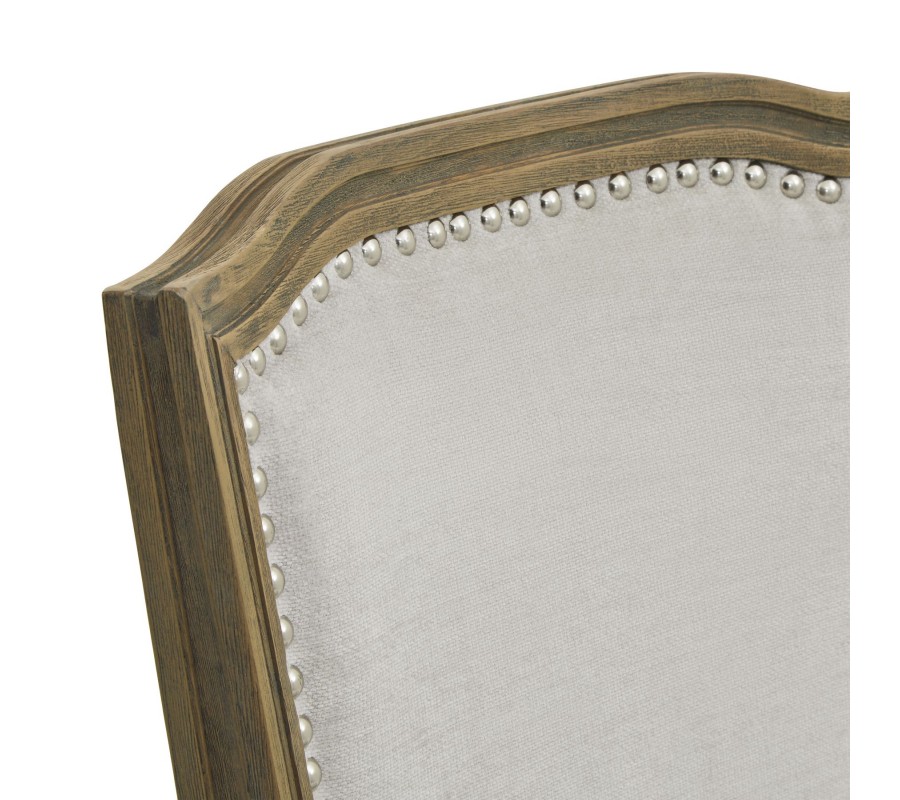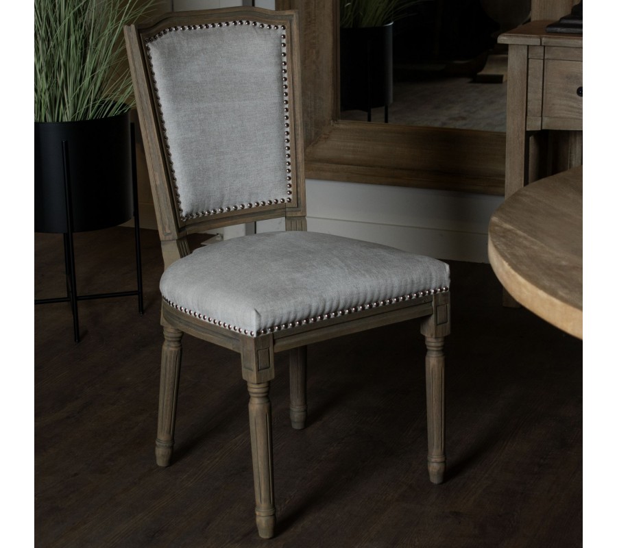 Luxusná jedálenský stolička Antiquités Francaises vám poskytne maximálny komfort a očarujúci vidiecky dizajn. Drevený rám v pieskovej hnedej farbe je opracovaný takzvaným washed efektom vymytej farby, ktorý mu dodáva šarmantný vintage charakter. Tvar nožičiek a opierky odkazuje na inšpiráciu klasickým vidieckym nábytkom. Drevený rám je vyrezávaný do vzorov a tvarov striedajúcich rovné línie s krivkami, čo dodáva stoličke delikátnu siluetu. Ručné spracovanie zaručuje veľkú pozornosť k detailom pri výrobe a zároveň originalitu každého kusu nábytku. Pohodlie vám zaručí čalúnená výplň opierky chrbta a sedacej časti s poťahovou látkou s hrubým tkaním vo svetlej bielosivej farbe, ktorá sa výborne prepojí so šedými odtieňmi dreva. Okraje čalúnených častí sú ozdobené striebornými vybíjanými líniami. Stolička skvele doplní jedálenské stoly z masívneho dreva so starožitnou úpravou, napríklad z rovnakej kolekcie Antiquités Francaises, ktoré nájdete v našej ponuke. Vďaka vyrezávanému zdobeniu sa tiež hodí do jedální zariadených vo vidieckom štýle, kde môžete pridať farebné vzorované textílie či maľovanú vázu.