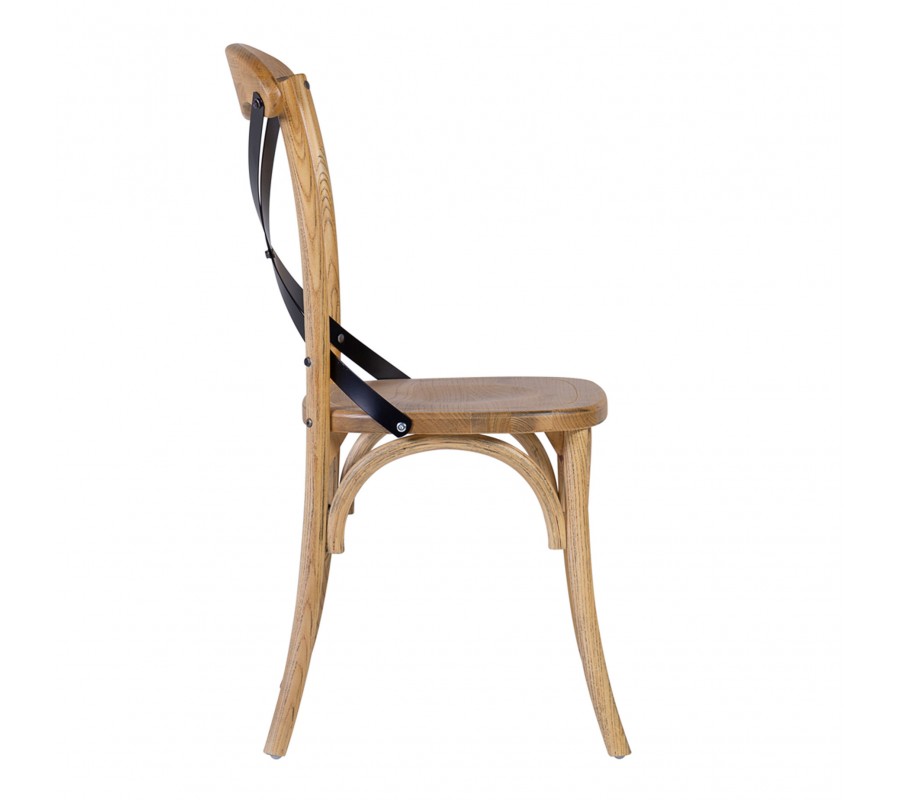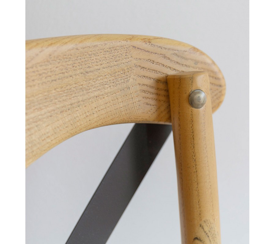 V strede opierky sa nachádza diagonálne umiestnený kovový kríž, ktorý kontrastuje s naturálnym charakterom dreva a do dizajnu prináša nádych industriálneho štýlu, zdôraznený viditeľnými skrutkami na spojoch stoličky.
