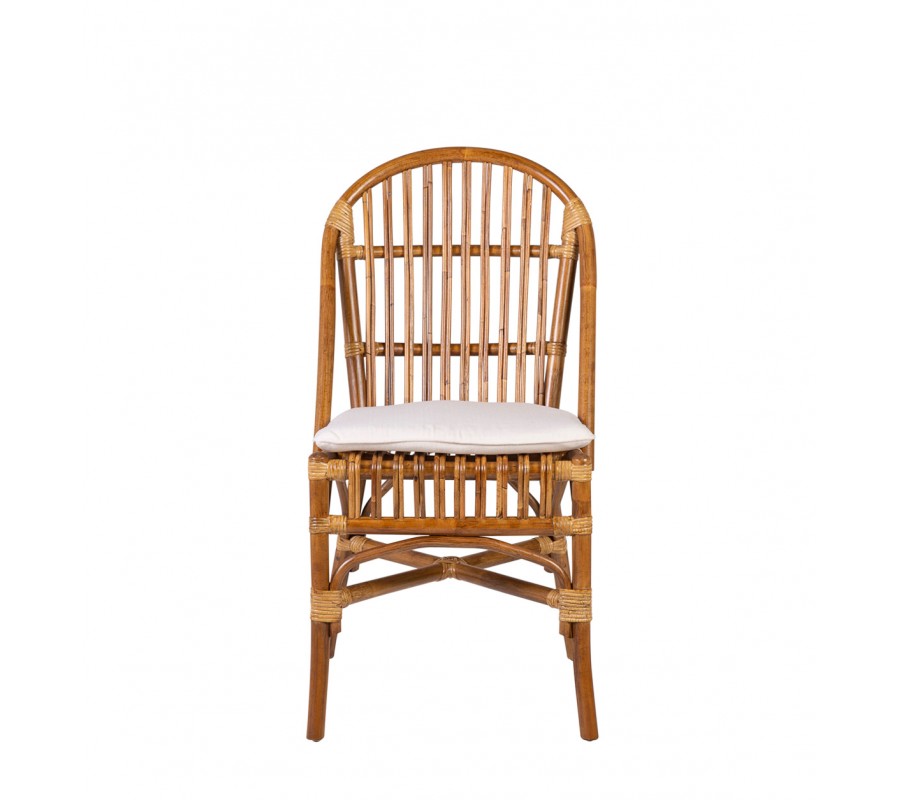 Štýlová jedálenksá stolička Sidney je jedinečný kúsok do vašej záhrady. Stolička je ručne vyrobená z kvalitného ratanového dreva, pre ktoré je typická pružnosť, pevnosť a odolnosť. Jej dominantou je zaujímavý vertikálny výplet na opierke chrbta a pod sedadlom. Operadlo je v hornej časii oblé a vytvarované do mierneho U tvaru. Z neho vedú dve bočné tyče, ktoré ohraničujú tvar staličky. Sedadlo je doplnené o čalúnený textnilný podsedák v bielej farbe, ktorý dodáva vášmu sedeniu komfort. Nožičky sú mierne vykrivené na ich spodu, pričom sú vzájomne prepojené krížovými spojmi, pre väčšiu stabilitu. Spoje na stoličke sú prekrité ratanovými vláknami pre estetický vzhľad.