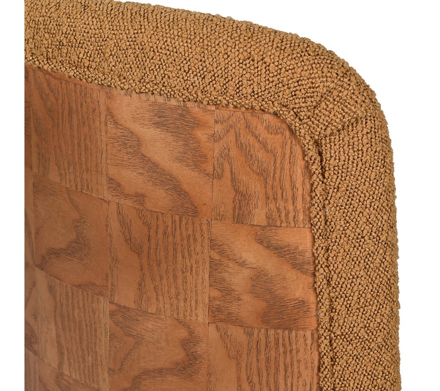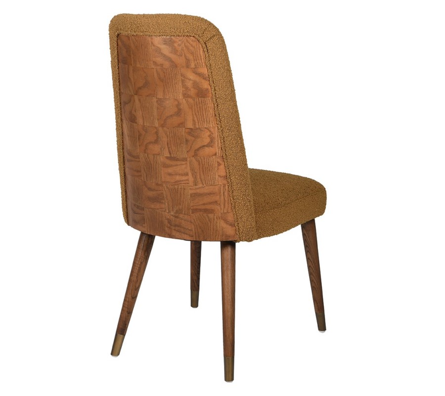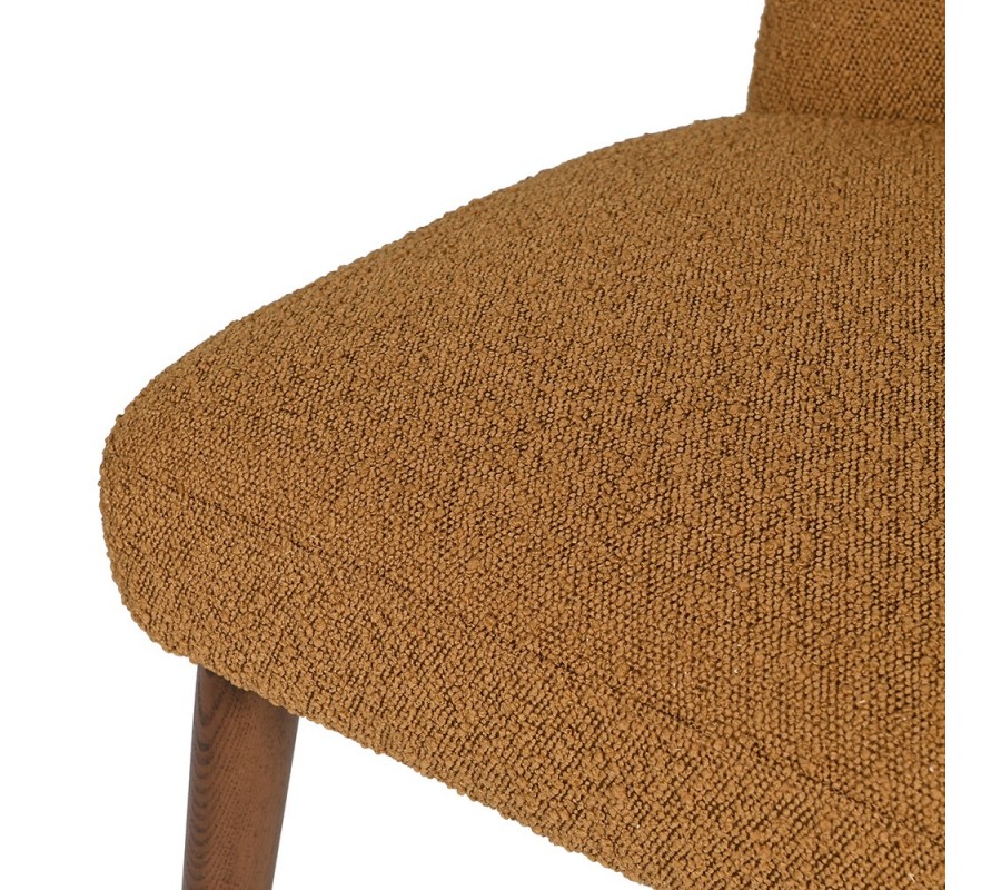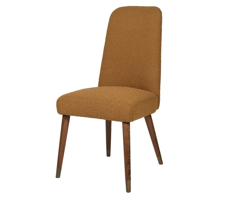 Jedálenská stolička Helen spája vo svojom originálnom dizajne prvky retro a art deco štýlu. Príjemná horčicová žltá farba v kombinácii s naturálnym vzhľadom dreva priestor zútulní a prinesie do neho pocit tepla, zatiaľ čo buklé látka a zlaté ukončenia nožičiek dodávajú nábytku nádych luxusu.