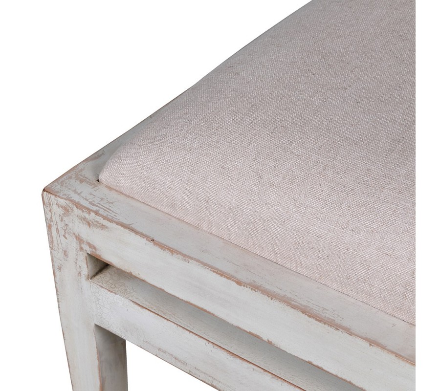 Rám stoličky je vyrobený z masívneho dreva a jeho povrch pokrýva svetlý náter so starožitnou povrchovou úpravou. Je miestami vkusne zošúchaný, čo priznáva pôvodnú farbu dreva a pripomína jeho naturálny charakter. Sedacia časť je čalúnená mäkkou penovou výplňou s textilným poťahom v krémovej farbe.
