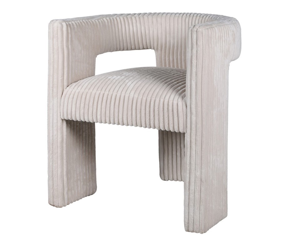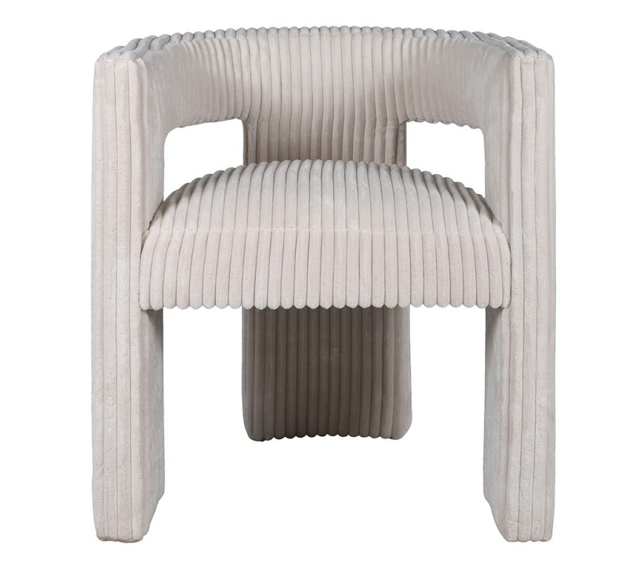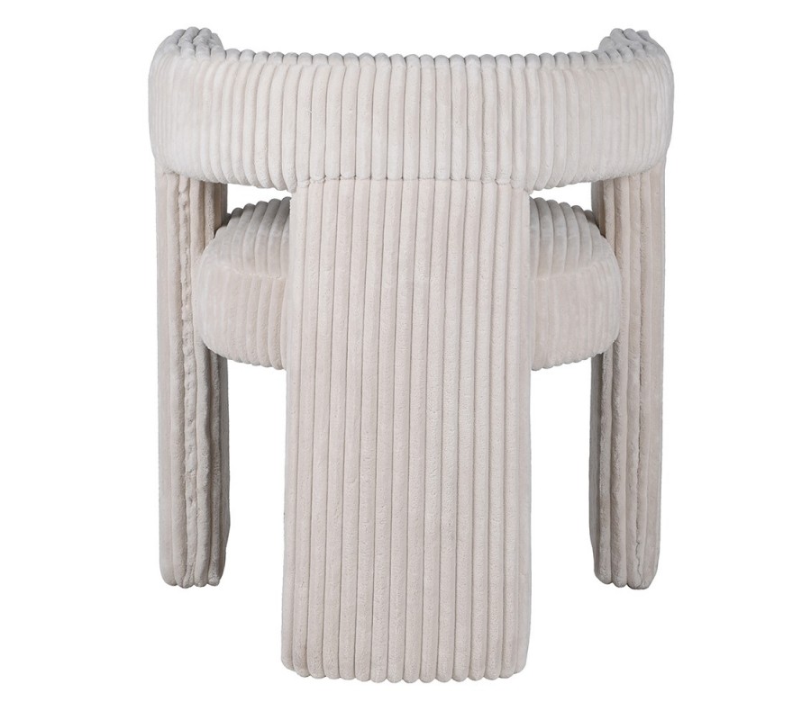 Dominantným prvkom dizajnu je poťah pokrývajúci celú plochu stoličky. Jeho konzistentný lineárny vzor vytvára ucelený a plynulý vizuál, ktorý prepája jednotlivé časti stoličky. Prešívanie pripomína hrubý menčester a látka s vyšším vlasom je príjemné na dotyk. Svetlá krémovo biela farba vyvažuje svojou eleganciou extravagantnú siluetu a výraznú štruktúru materiálu.