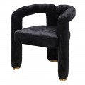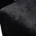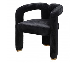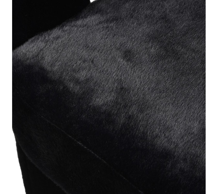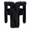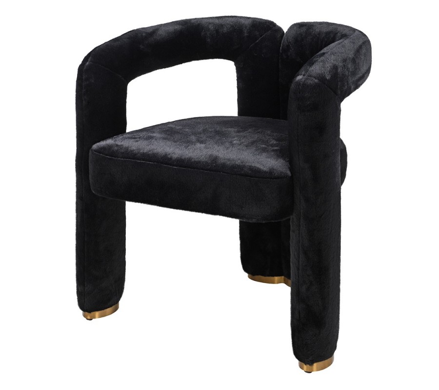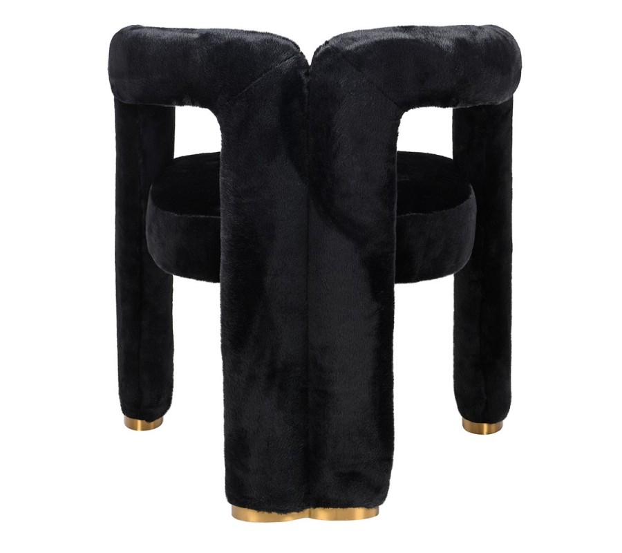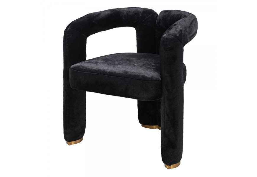 Pohodlie vám zaručí mäkké penové čalúnenie a na dotyk príjemný poťah z umelej kožušiny, ktorý pokrýva celú plochu stoličky. Moderná silueta tak pôsobí jednotným dojmom a čierna farba prináša do kompozície eleganciu, vyvažujúcu extravagantné prvky. Nožičky majú kovové ukončenie v zlatej farbe a kombinácia ónyxovo čiernej kožušiny s lesklým metalickým detailom podčiarkuje art deco estetiku.