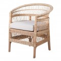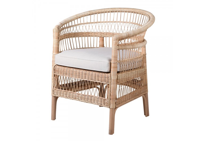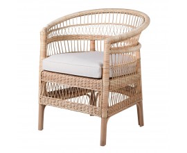 Dizajnová pletená svetlo hnedá ratanová jedálenská stolička Bali s bielym vankúšom 85 cm