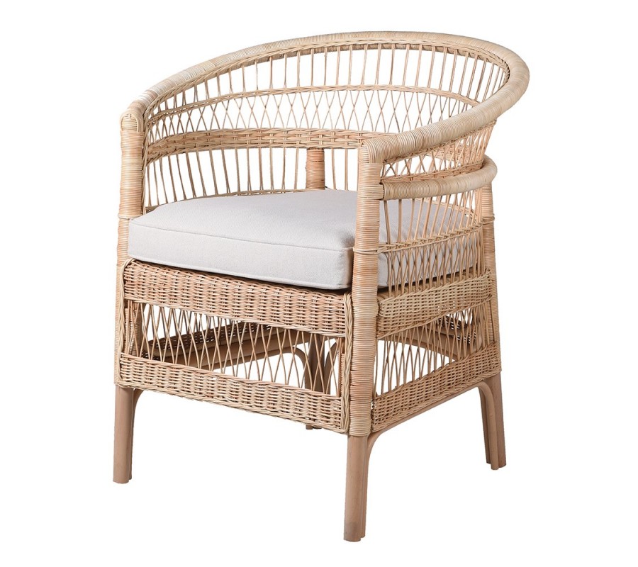 Stolička má otvorenú konštrukciu s jedinečným výpletom zo svetlo hnedého ratanu, ktorý je ručne a starostlivo spletený do zložitého vzoru. Opierková časť je tvorená vzdušnejším jednoduchším vzorom, zatiaľ čo celková konštrukcia z masívneho mahagónového dreva je precízne a na husto ratanovými prútmi obtočená do dokonalosti. Tým drevenú konštrukciu nie len chráni, ale aj ju esteticky prepája s charakterom celej stoličky. Samotný rám stoličky z lakovaného mahagónového dreva je viditeľne priznaný na štyroch stabilných nožičkách. Tento luxusný materiál disponuje perfektnými vlastnosťami ako sú vysoká odolnosť, pevnosť a trvácnosť.
