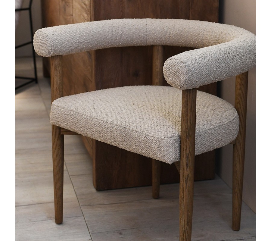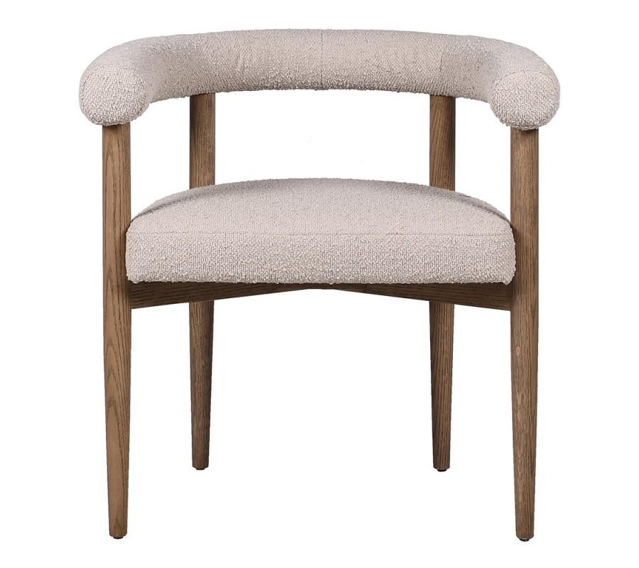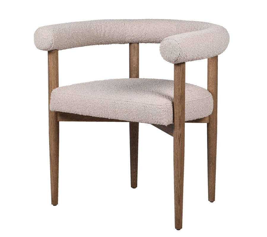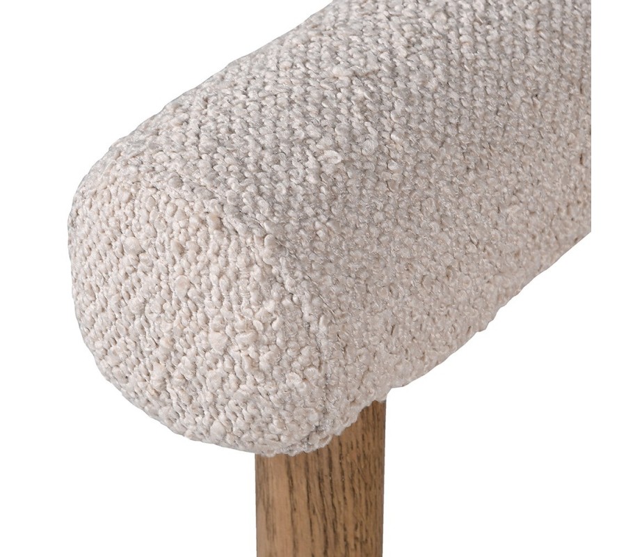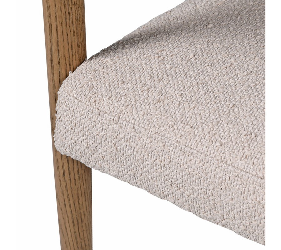 Rám stoličky je vyrobený z masívneho dreva v naturálnej svetlej hnedej farbe s jemnou štruktúrou letokruhov. Teplé tóny dreva skvele dopĺňa textilný poťah v béžovej farbe. Výrazná štruktúra buklé látky dizajn ozvláštňuje a zároveň mu dodáva nádych luxusu. Materiál je príjemný na dotyk a v kombinácii s penovým čalúnením vám zaručí maximálny komfort pri sedení.