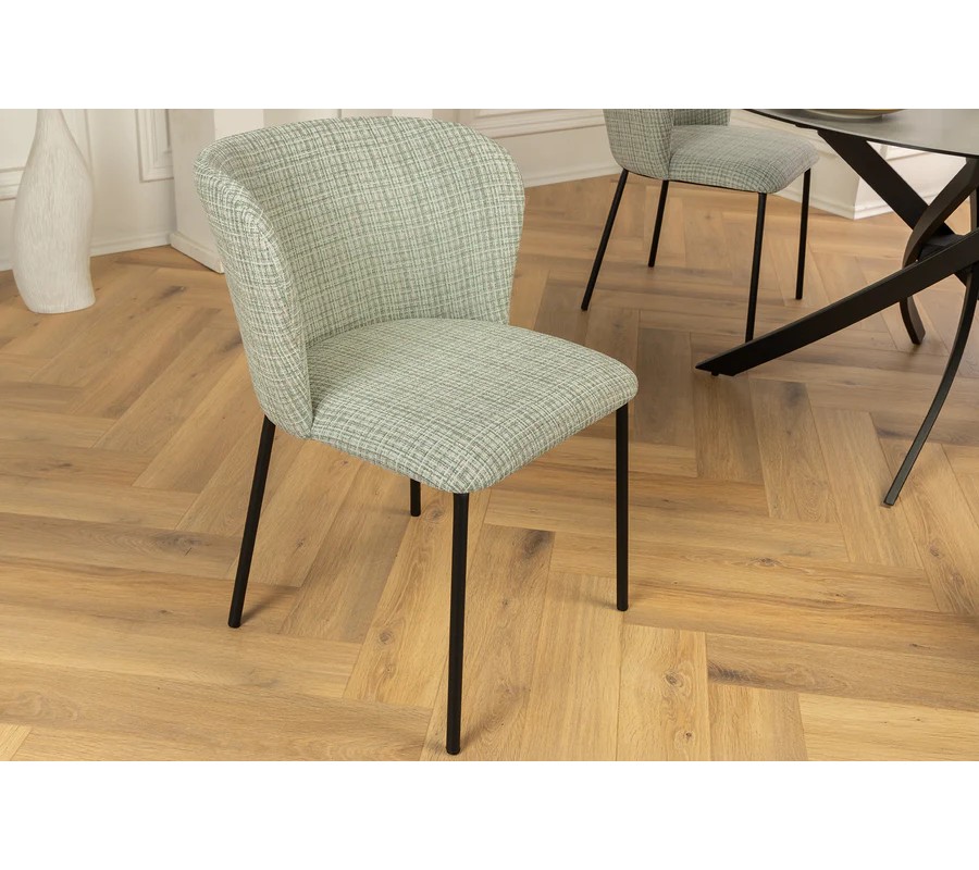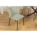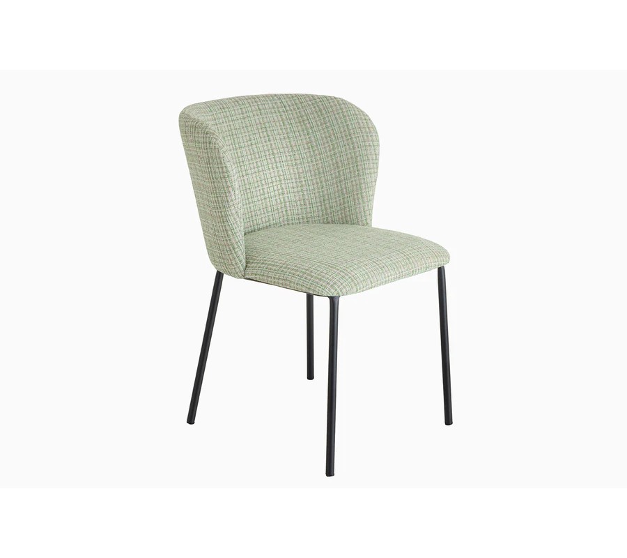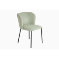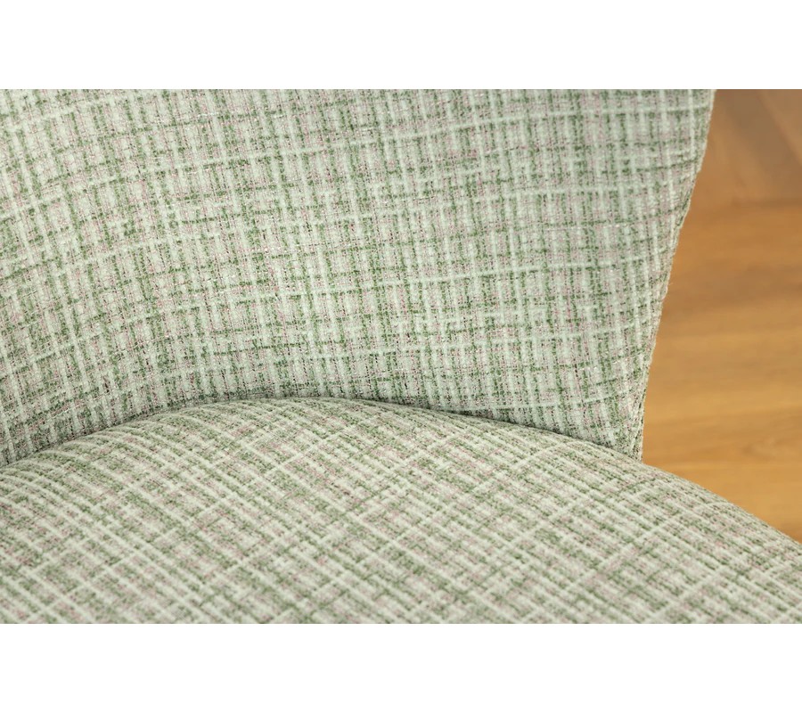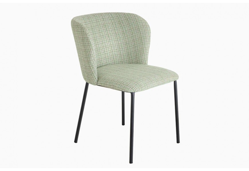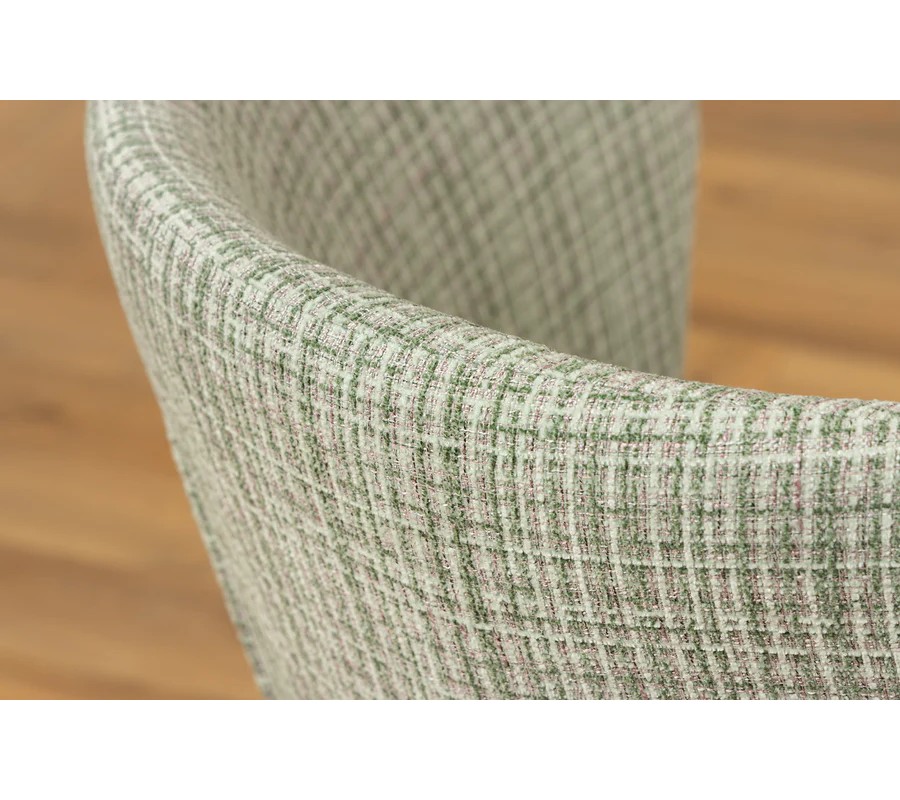 Jedálenská stolička s elegantným a moderným dizajnom je ideálnym doplnkom pre štýlové interiéry. Sedacia časť a operadlo sú čalúnené textíliou v jemnom zelenom odtieni s jemným károvaným vzorom, ktorý dodáva stoličke zaujímavú textúru a vizuálnu hĺbku. Povrch čalúnenia je mäkký a príjemný na dotyk, pričom poskytuje pohodlie pri sedení.