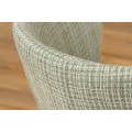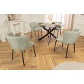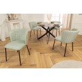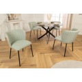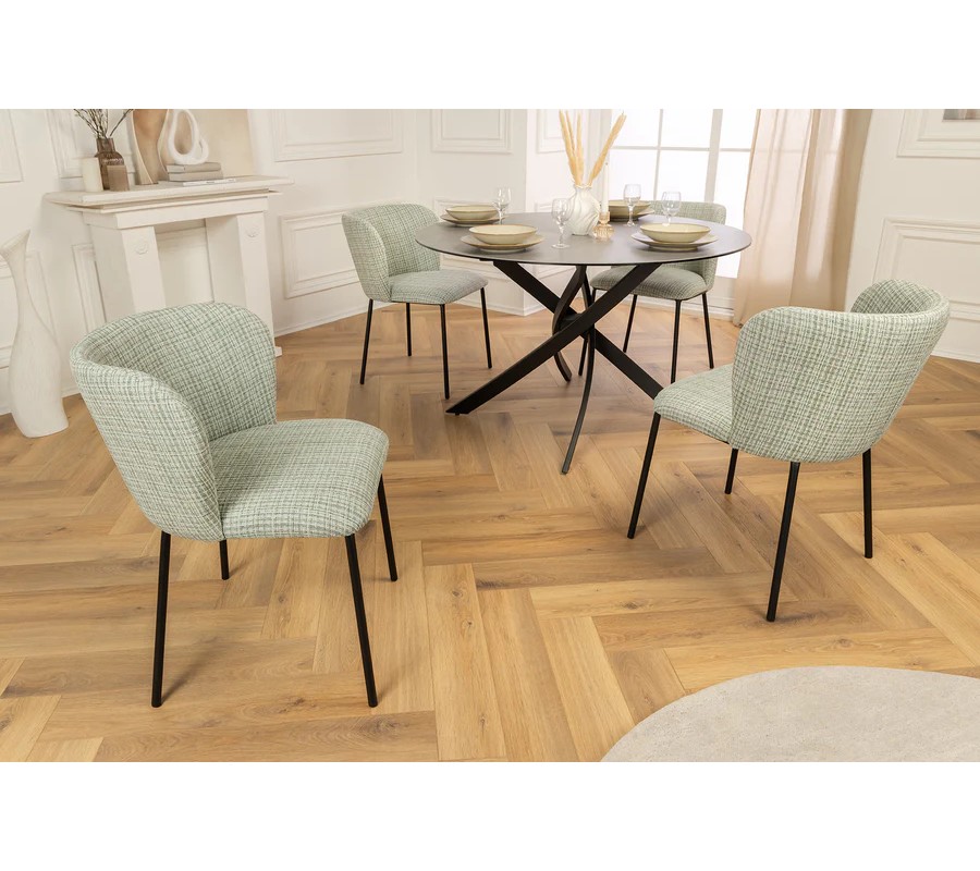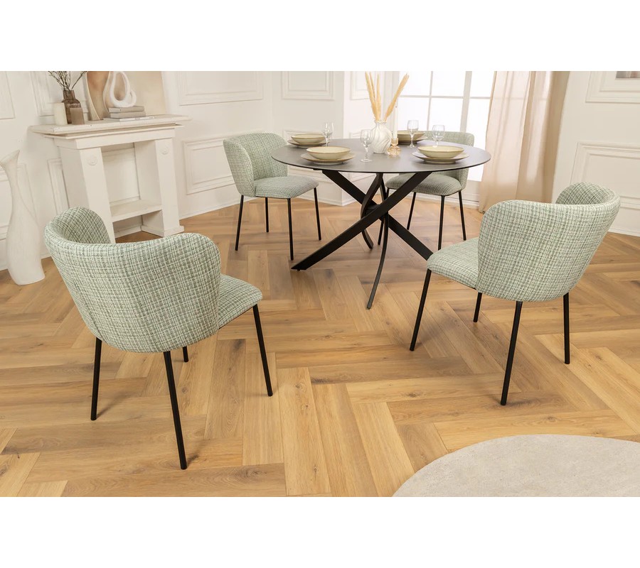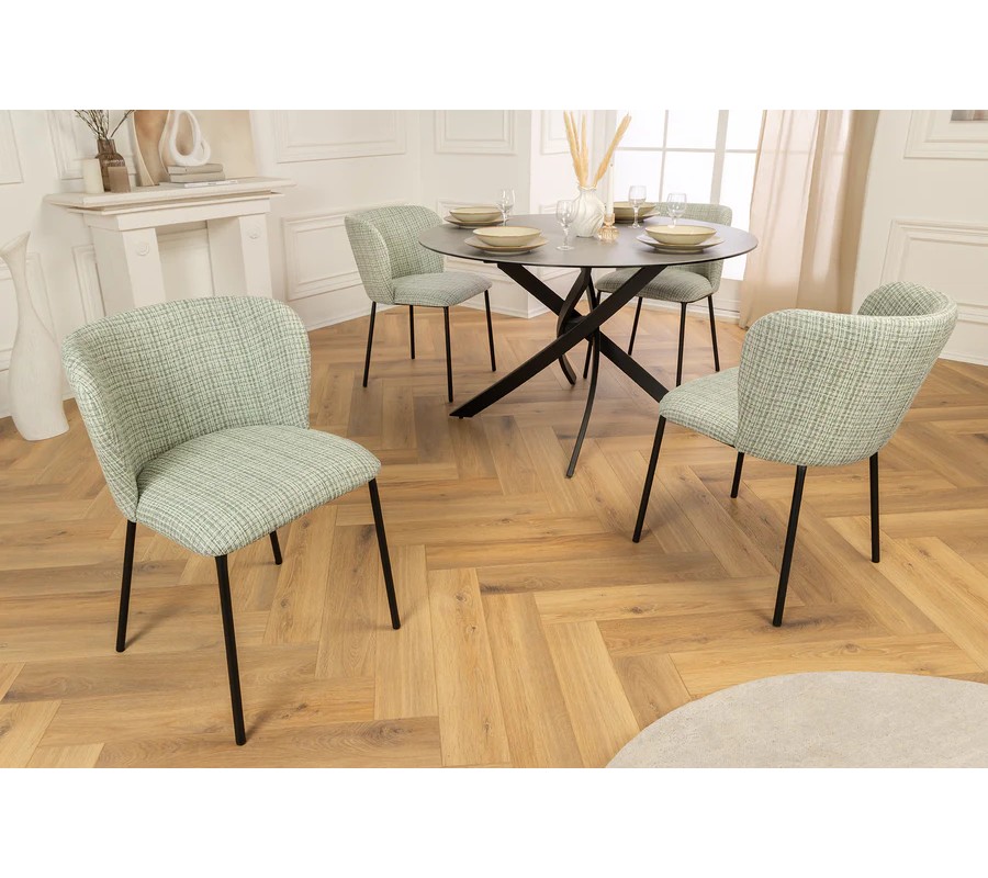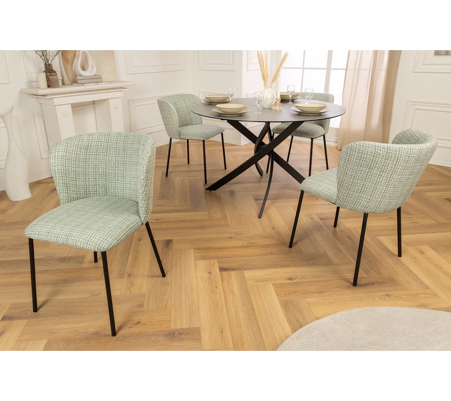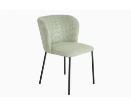 Jedálenská stolička s elegantným a moderným dizajnom je ideálnym doplnkom pre štýlové interiéry. Sedacia časť a operadlo sú čalúnené textíliou v jemnom zelenom odtieni s jemným károvaným vzorom, ktorý dodáva stoličke zaujímavú textúru a vizuálnu hĺbku. Povrch čalúnenia je mäkký a príjemný na dotyk, pričom poskytuje pohodlie pri sedení.