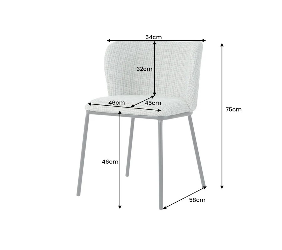 Tvar stoličky je ergonomický, s jemne zaobleným operadlom, ktoré plynule prechádza do sedacej časti, čo prispieva k pohodlnému opieraniu a estetickému vzhľadu. Nohy stoličky sú vyrobené z kovu v matnom čiernom prevedení, čo vytvára moderný kontrast s farebnosťou čalúnenia. Štíhle, rovné nohy dodávajú stoličke stabilitu a elegantnú jednoduchosť.