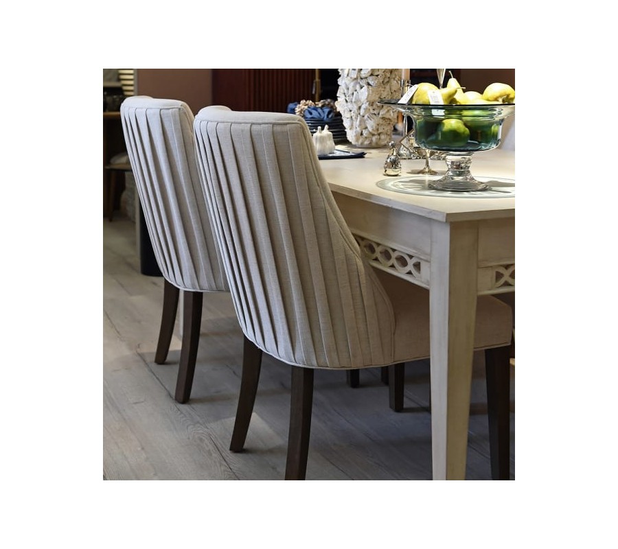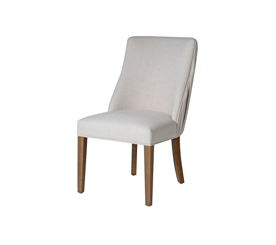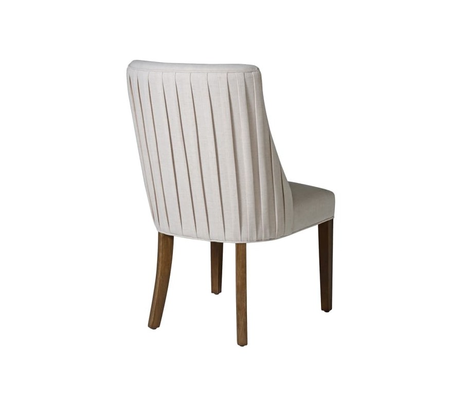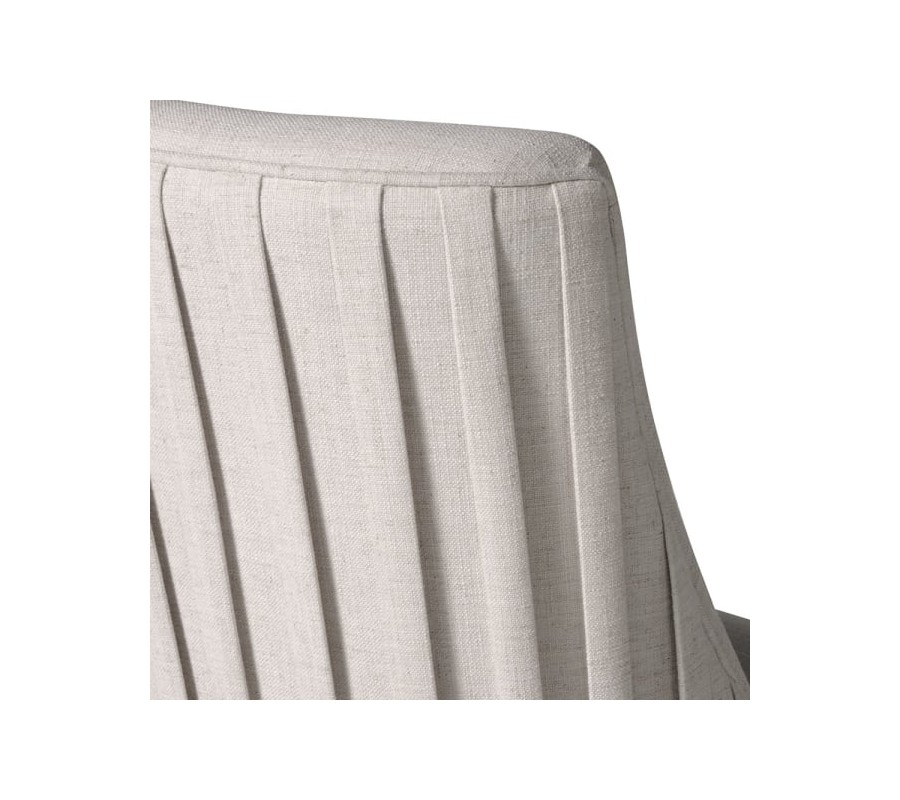 jedálenská stolička Flax má elegantný a harmonický tvar s vysokým operadlom, ktoré je na zadnej strane zdobené vertikálnym prešívaním, čím dodáva stoličke sofistikovaný vzhľad. Poťah je vyrobený z jemnej textílie v krémovej farbe, ktorá pôsobí nadčasovo a ľahko sa kombinuje s rôznymi interiérovými štýlmi. Čalúnenie je mäkké, pohodlné a precízne spracované, čo zaisťuje komfort pri sedení. Stolička nemá bočné opierky, vďaka čomu si zachováva ľahkosť a minimalistický dizajn.