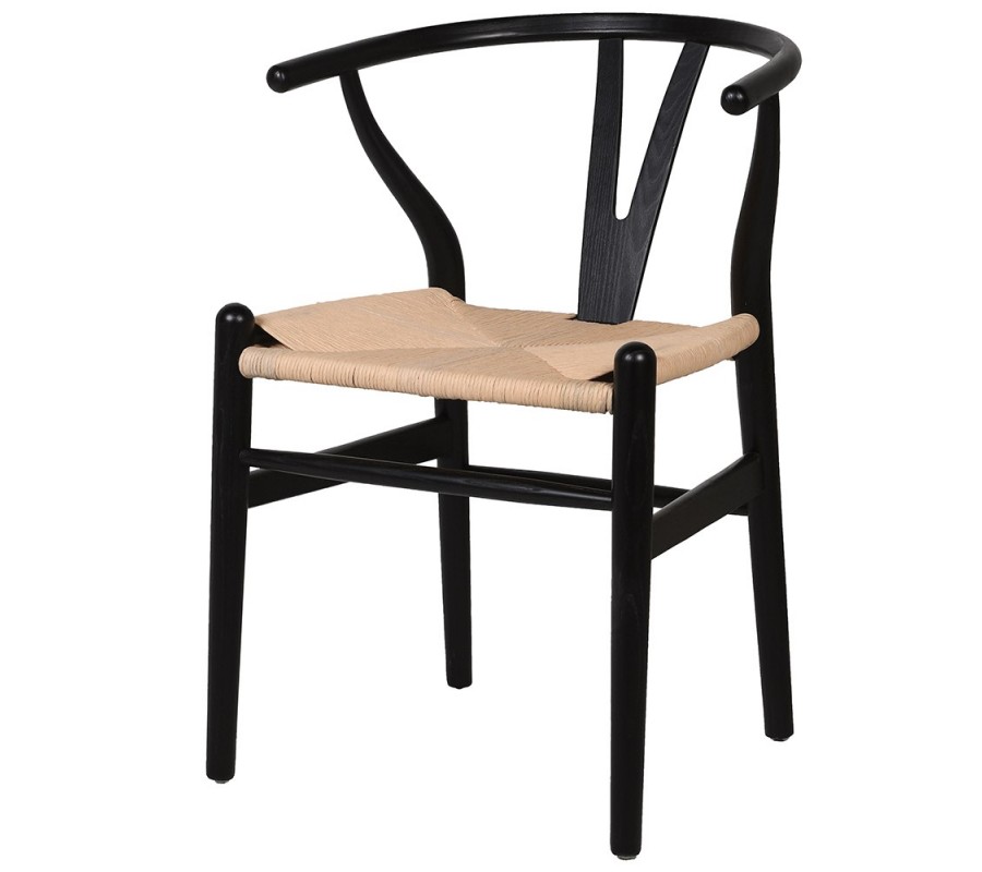Dizajnová jedálenská stolička Gaffelboen z masívneho dreva s konštrukciou v čiernej farbe a sedadlo so hnedým výpletom 77 cm