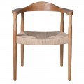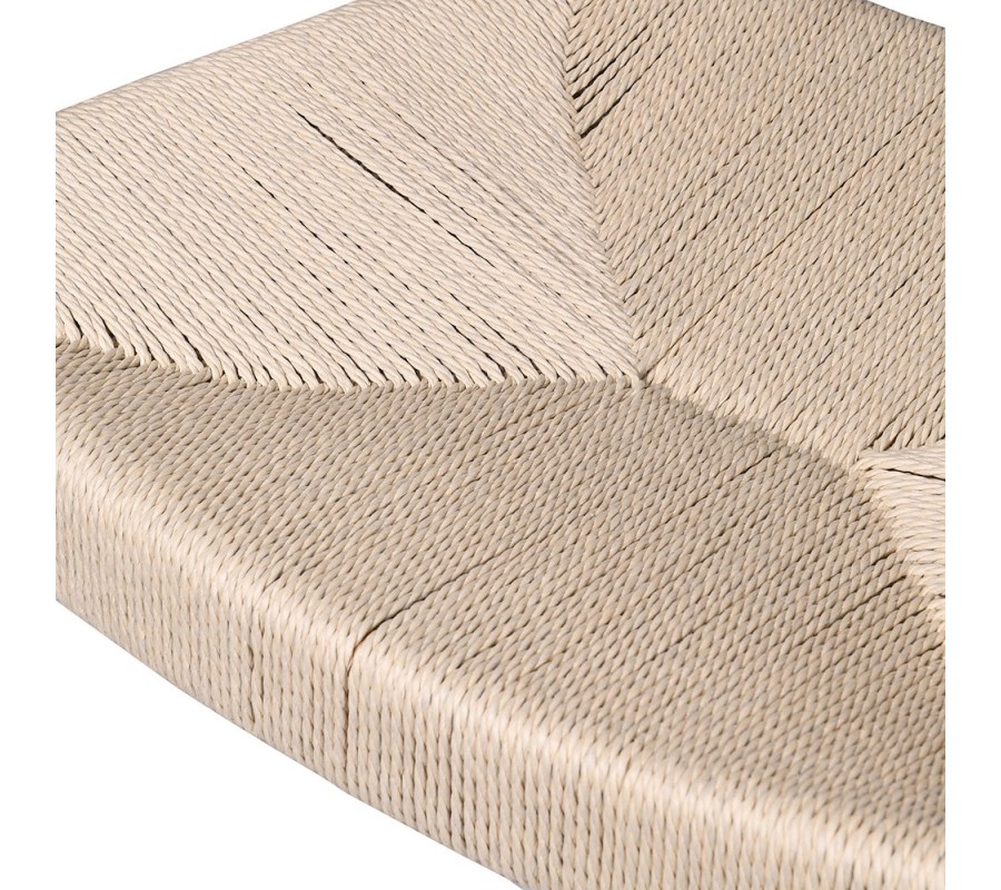Sedadlo je upletené z povrazu, takzvaný paper cord, ktorý je usporiadaný do stredu stoličky tak, že vzájomne prekrížené vlákna vytvárajú jemný geometrický vzor. Tento prírodný, svetlý hnedý materiál dopĺňa farbu dreva a dodáva stoličke vzdušný a útulný vzhľad.