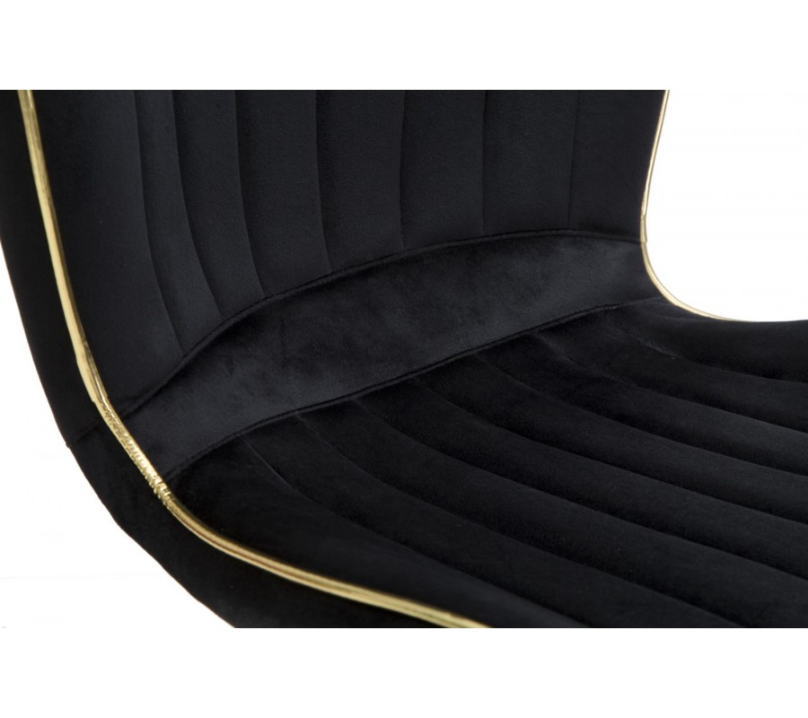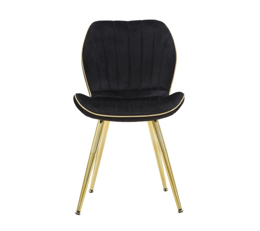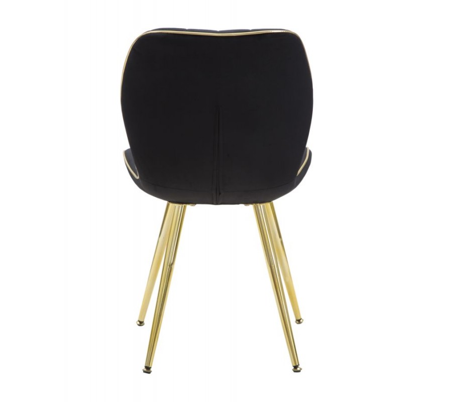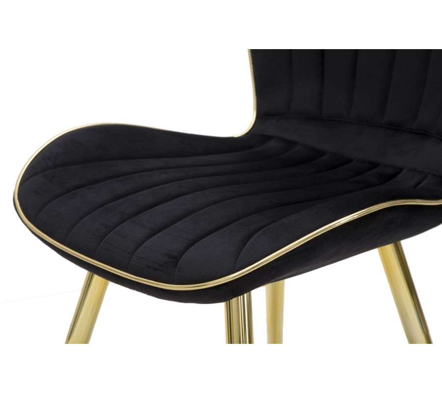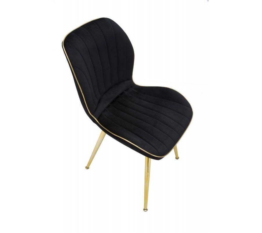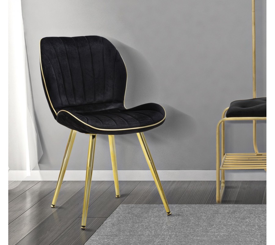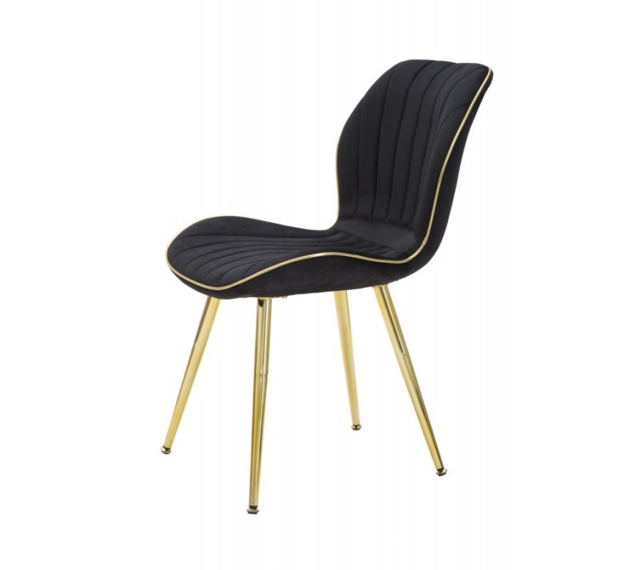 Jedálenská stolička Dorena v štýle art deco a glamour je luxusným doplnkom do elegantných interiérov. Čierne zamatové čalúnenie jej dodáva sofistikovaný vzhľad a zároveň poskytuje príjemný pocit pri sedení. Vertikálne prešívanie na operadle a sedacej časti vytvára vizuálne atraktívny efekt a podčiarkuje jej štýlový charakter.
