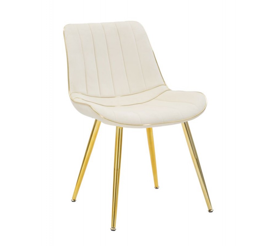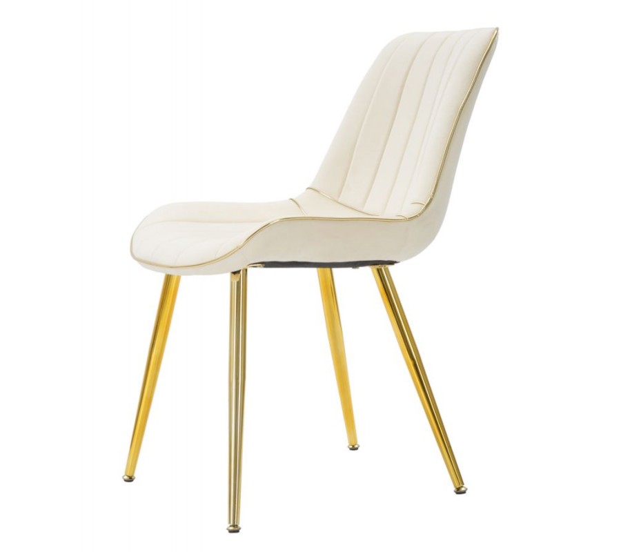 Rám s lesklou zlatou povrchovou úpravou sa nachádza okolo chrbtovej opierky a aj v časti, kde sa stolička ohýba a prepája do sedadla. Podčiarkuje exkluzívny vzhľad stoličky, zatiaľ čo štíhle, mierne skosené nožičky zabezpečujú stabilitu a zároveň pôsobia vzdušne a ľahko. Stolička nemá bočné opierky, čo jej dodáva nadčasový charakter, vďaka čomu sa dokonale hodí k rôznym typom jedálenských stolov. Ideálna je do luxusných jedální, štýlových reštaurácií, kaviarní alebo hotelových salónikov, kde vynikne jej noblesný vzhľad. Perfektne sa kombinuje s jedálenskými stolmi so zlatými alebo mosadznými detailmi, najmä s mramorovou, sklenenou alebo lakovanou doskou. Skvelo zapadne do interiérov v jemných odtieňoch béžovej, smotanovej, púdrovej ružovej alebo tmavomodrej, ktoré podčiarknu jej exkluzívny dizajn.