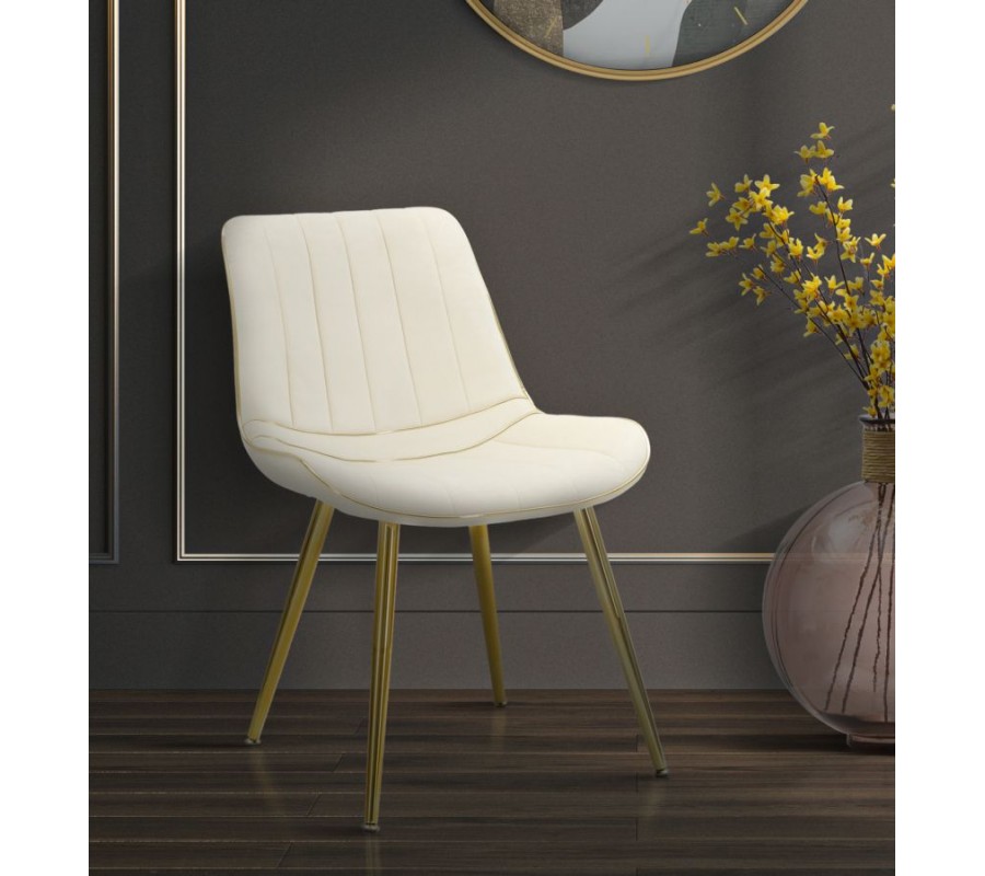 Jedálenská stolička Asen v art deco a glamour štýle je elegantným spojením luxusného dizajnu a nadčasovej estetiky. Jej zamatový poťah v krémovej farbe pôsobí mäkko a sofistikovane, pričom dodáva interiéru jemný nádych elegancie. Sedacia aj operadlová časť sú zdobené vertikálnym prešívaním, ktoré zvýrazňuje elegantné línie a dodáva povrchu zaujímavú textúru.