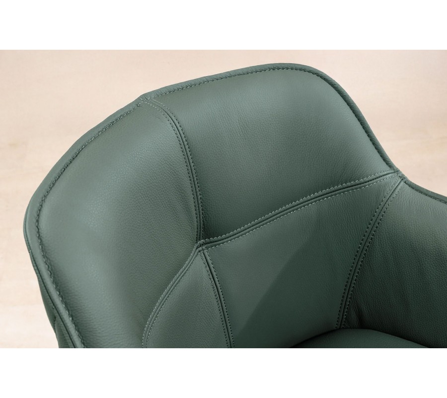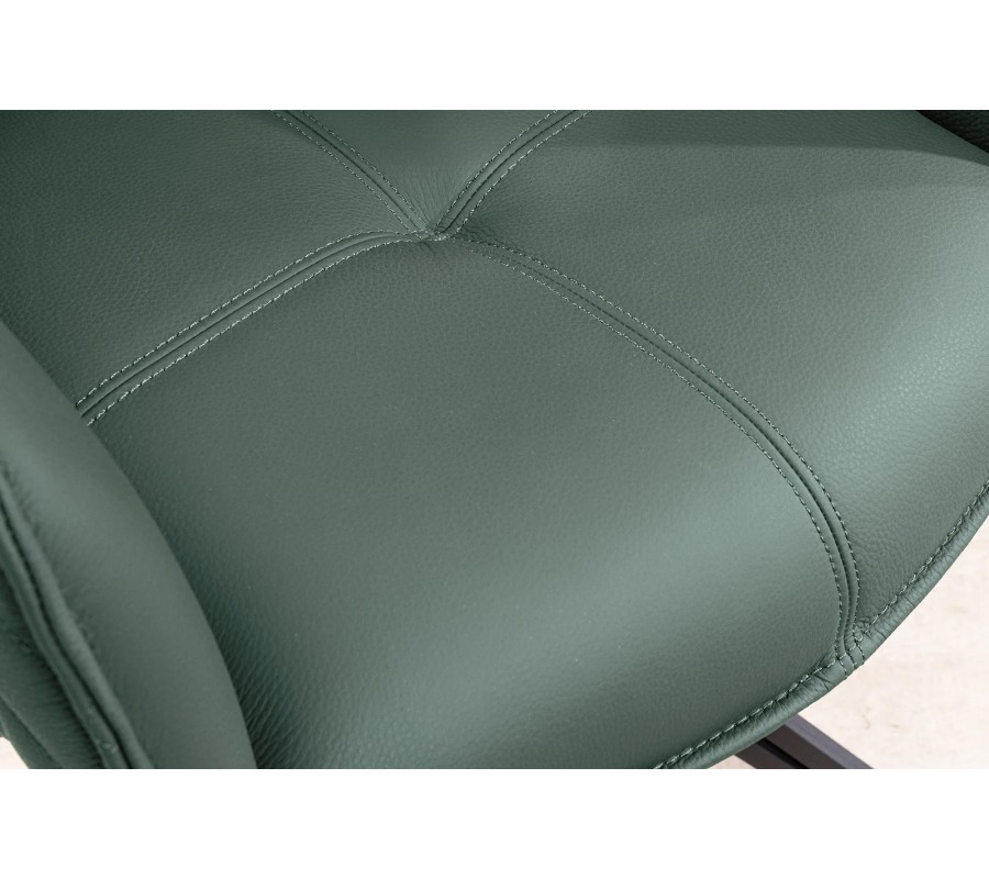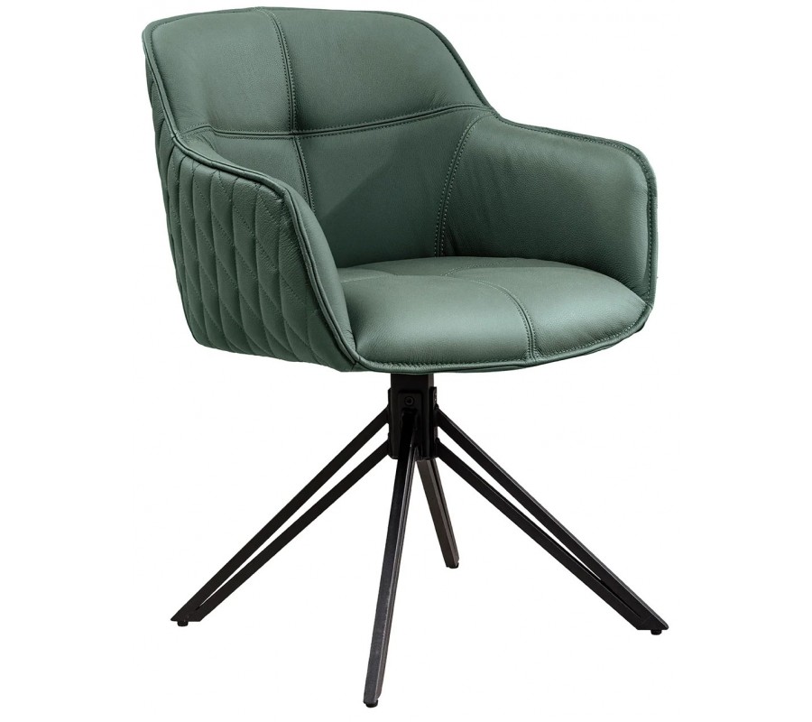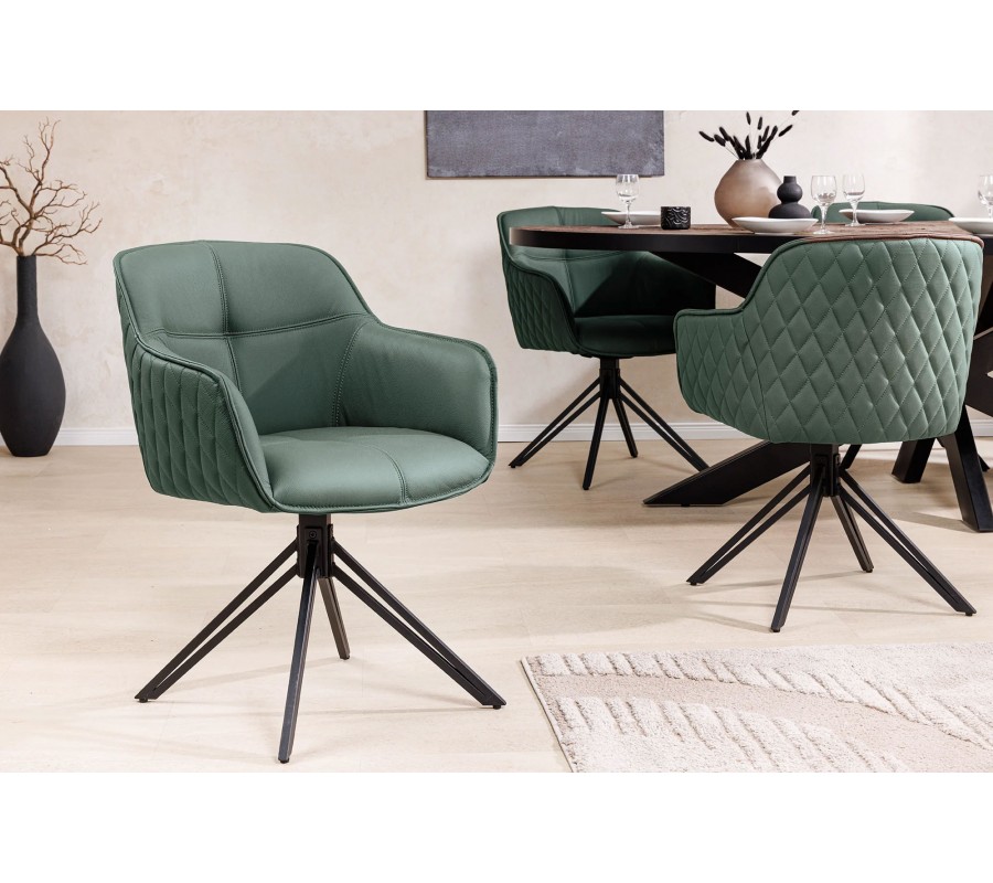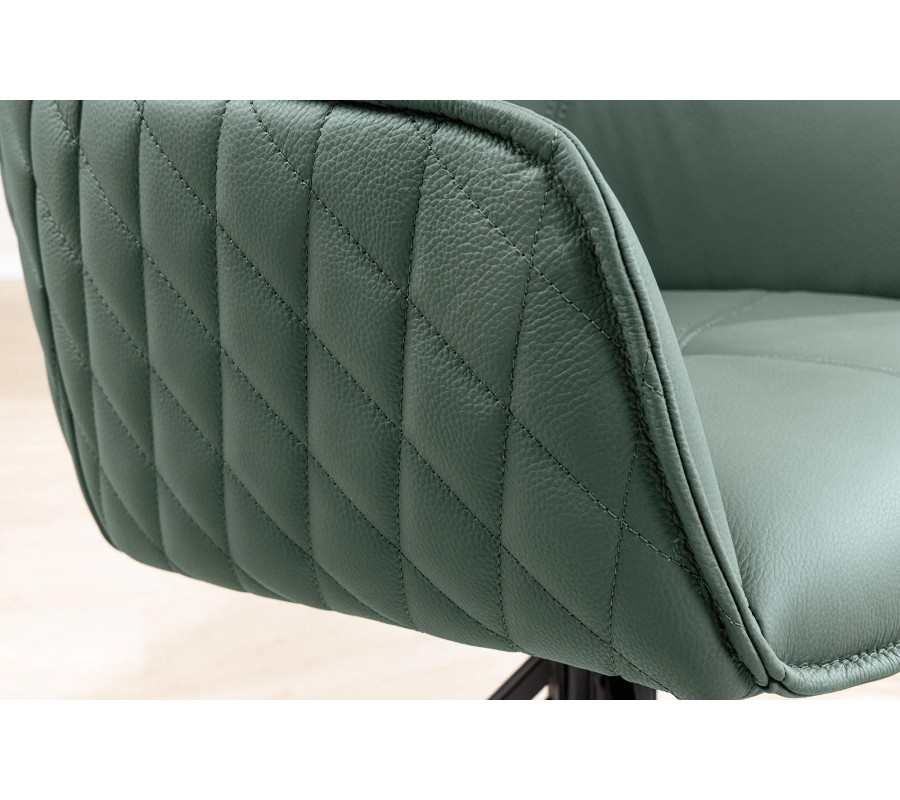Dizajnová jedálenská otočná stolička Lione s prešívaným vzorom v zelenej koži s opierkami na ruky s čiernou podstavou 82 cm