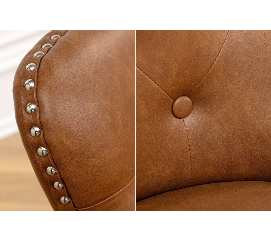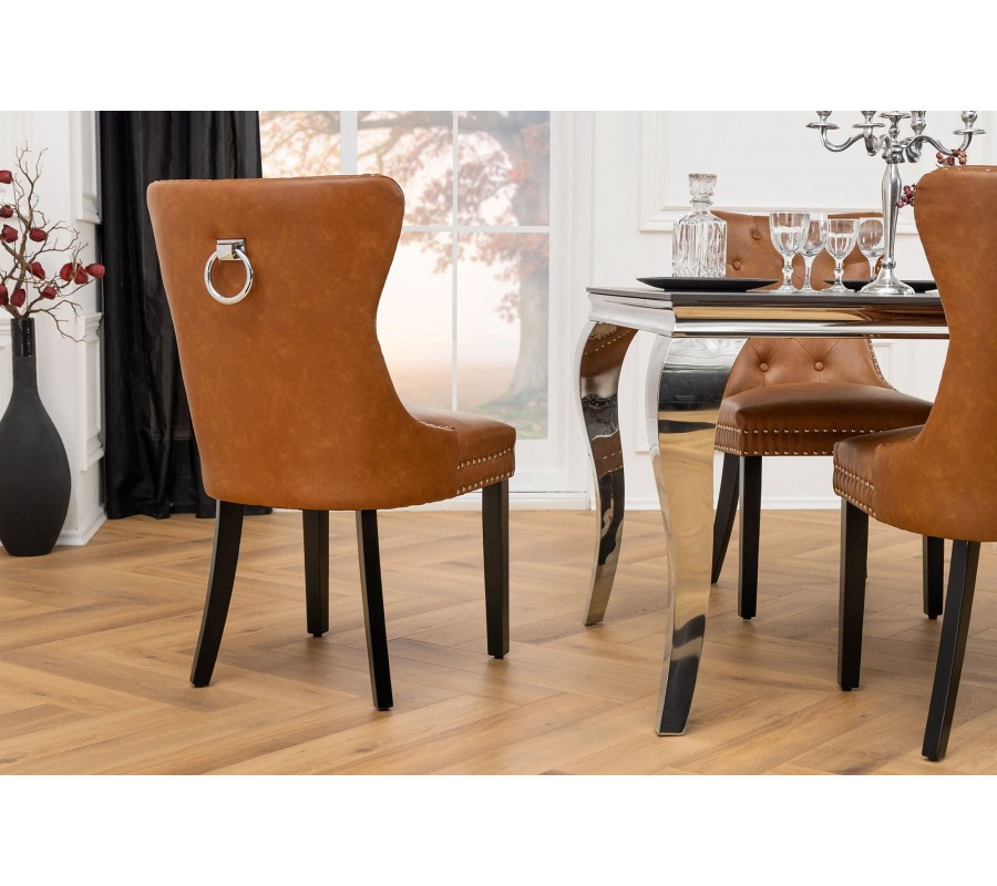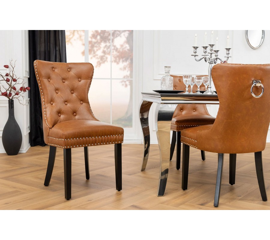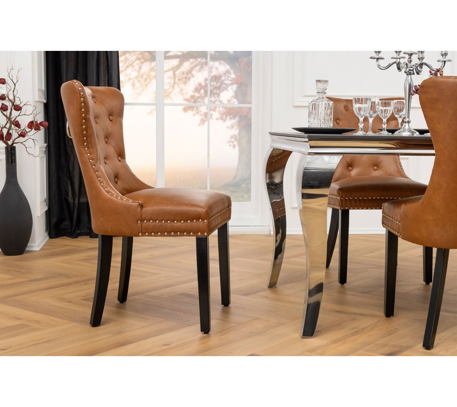 Jedálenská stolička Torino v ikonickom chesterfield štýle prinesie do vášho interiéru sofistikovanosť a nadčasovú eleganciu. Vysoké operadlo je zdobené prešívaním s okrúhlymi gombíkmi, ktoré vytvárajú typický vzor pre tento štýl. Čalúnenie je vyrobené z hnedej ekokože, ktorá pôsobí luxusne a zároveň je praktická na údržbu.