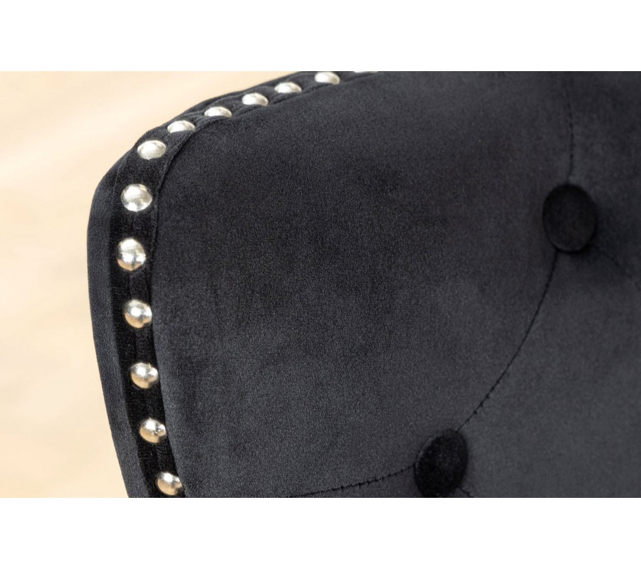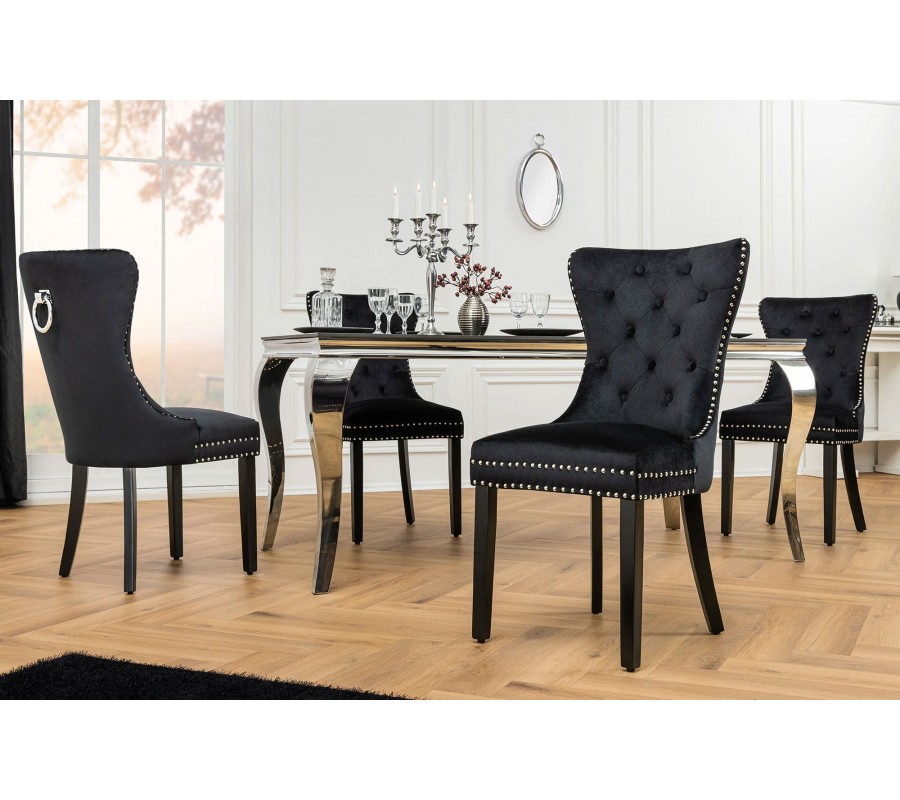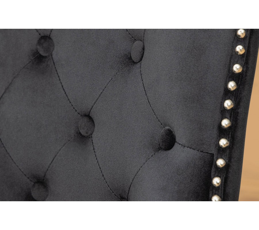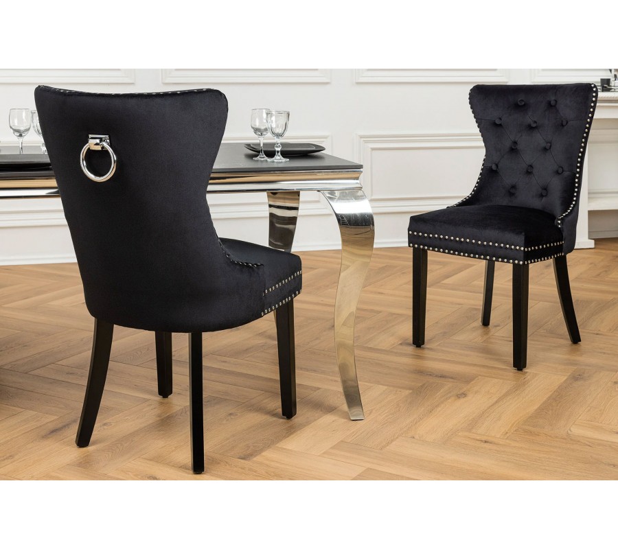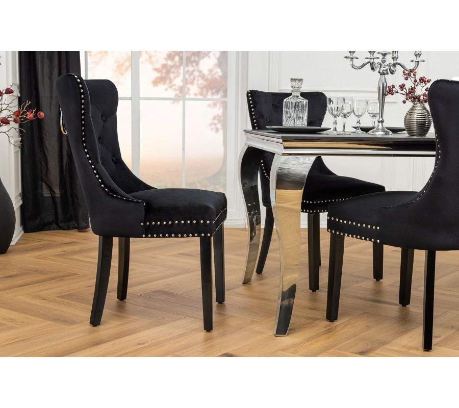 Jedálenská stolička Torino v chesterfield štýle prináša elegantný dizajn s luxusným čiernym zamatovým poťahom a vysokým operadlom s prešívaním čalúnením. Prešívanie s gombíkmi dodáva klasický vzhľad, zatiaľ čo strieborné dekoračné nity pozdĺž okrajov operadla podčiarkujú jej exkluzívny charakter.