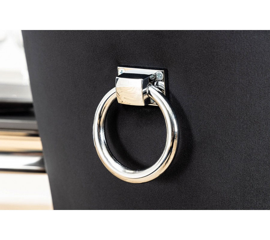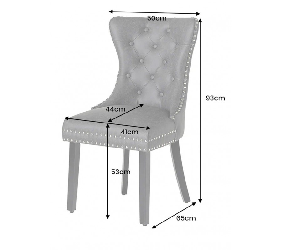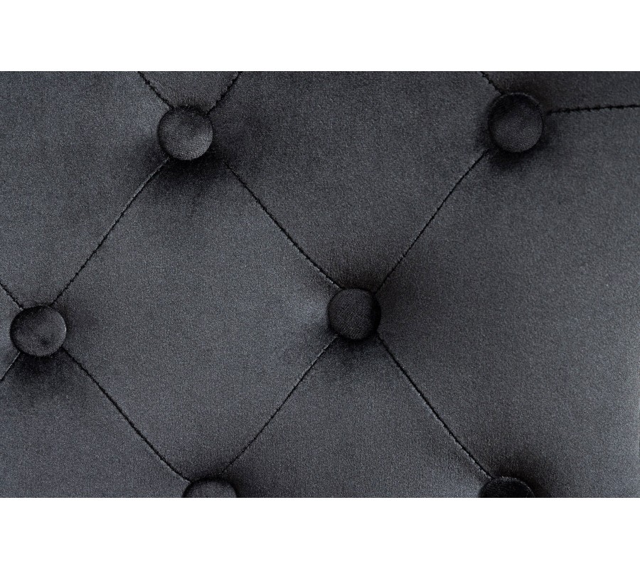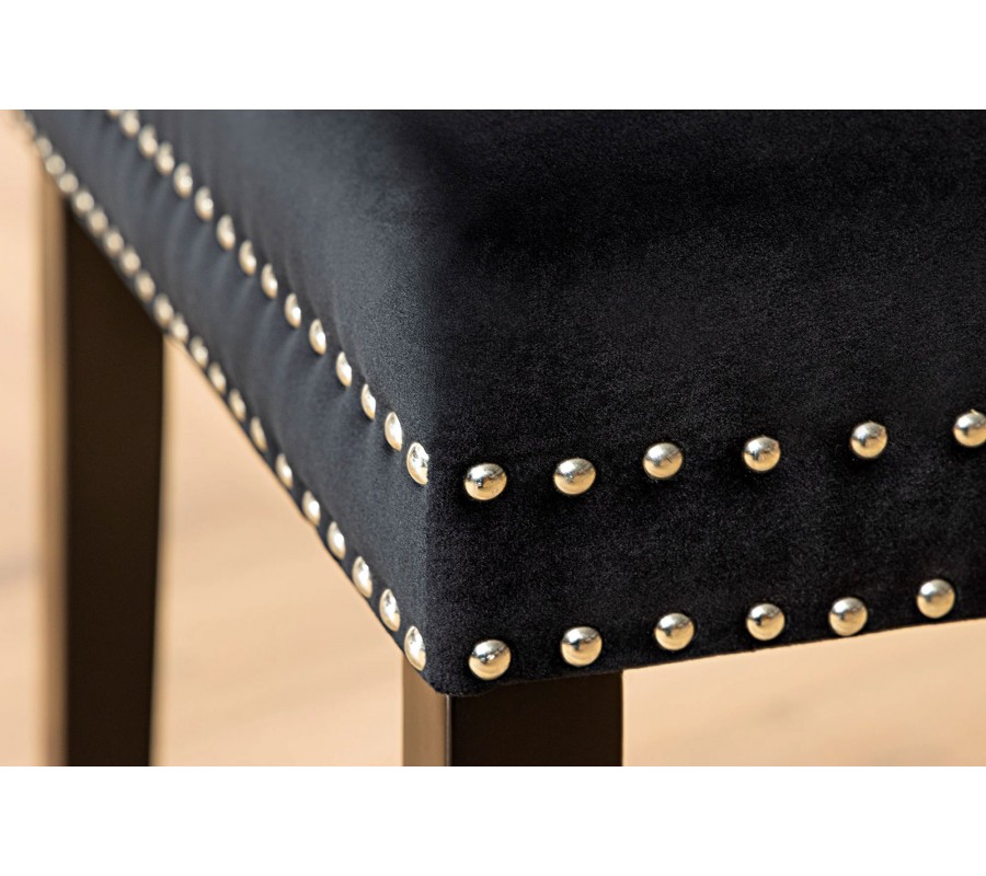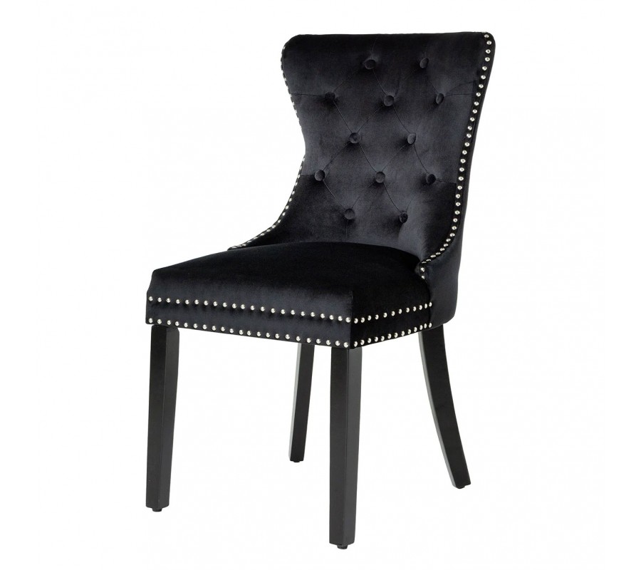 Jedálenská stolička Torino v chesterfield štýle prináša elegantný dizajn s luxusným čiernym zamatovým poťahom a vysokým operadlom s prešívaním čalúnením. Prešívanie s gombíkmi dodáva klasický vzhľad, zatiaľ čo strieborné dekoračné nity pozdĺž okrajov operadla podčiarkujú jej exkluzívny charakter.