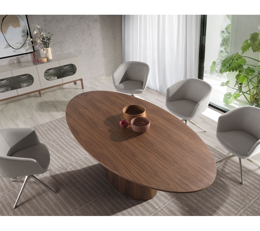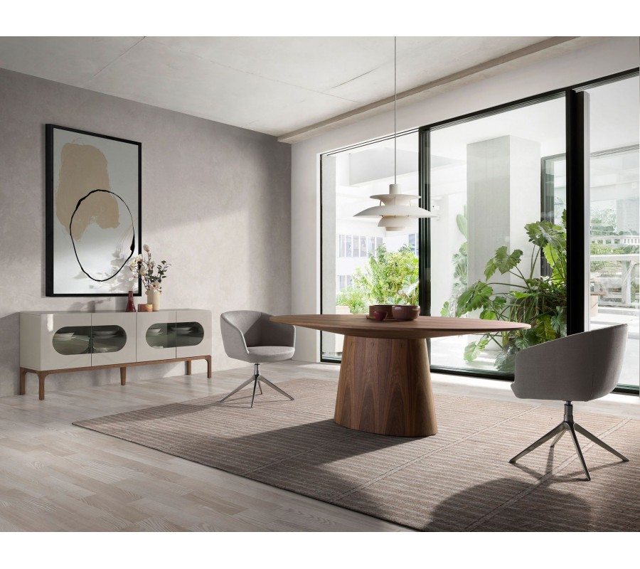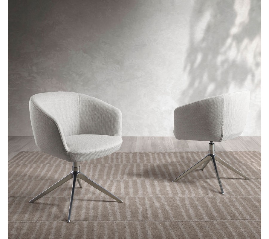 Sedacia časť je položená na otočnej nohe, ktorá sa v spodnej časti rozširuje do štvorramennej podstavy. Kombinácia štíhlych línií a vysoko lesklého povrchu pôsobí vzdušným dojmom a vizuálne odľahčuje dizajn.