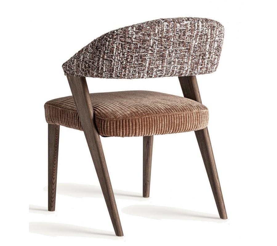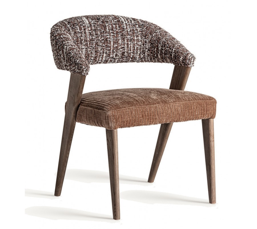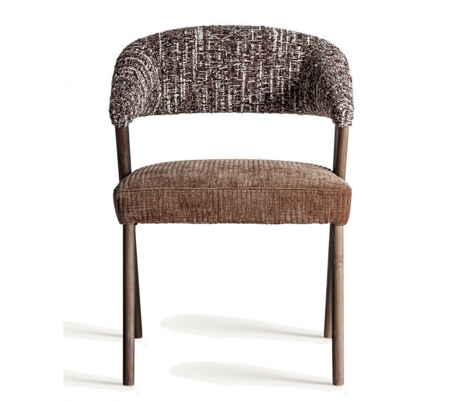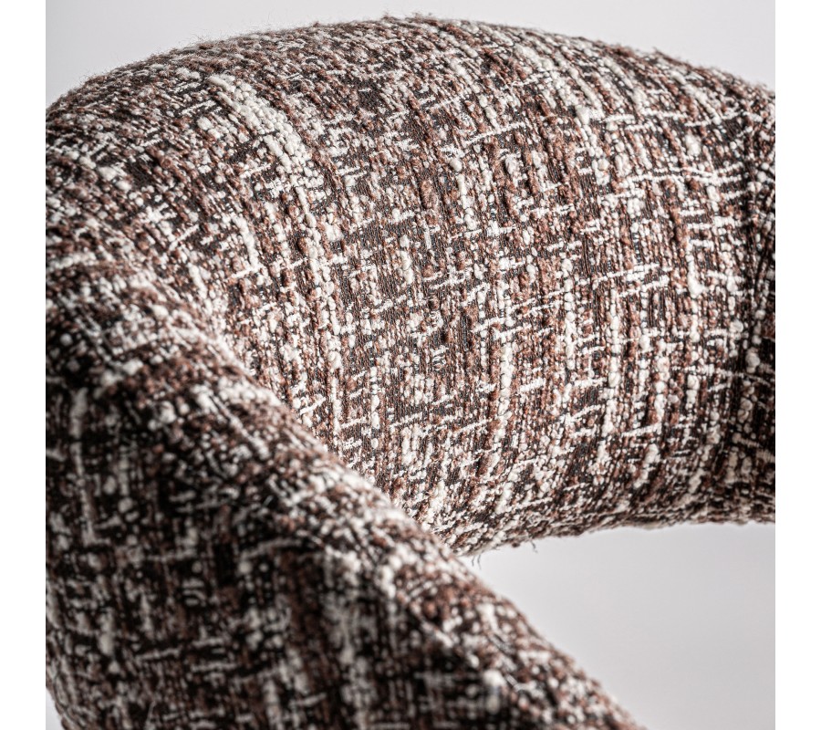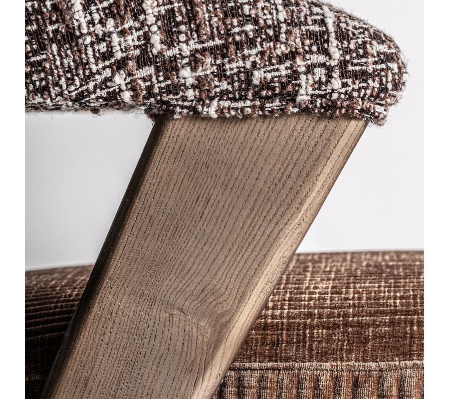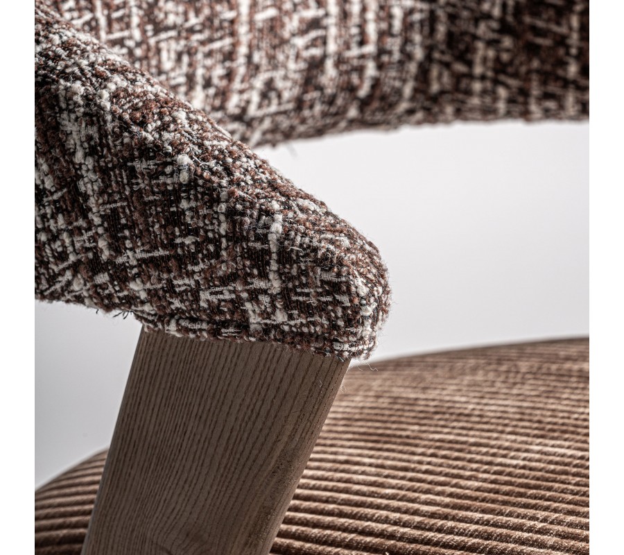 Sedadlo je čalúnené prémiovým menčestrovým poťahom v teplej hnedej farbe, ktorý sa vyznačuje vrúbkovaným povrchom, príjemným na dotyk. Operadlo a opierky sú pokryté zamatovo tkanou látkou s melírovaným vzorom v odtieňoch hnedej a bielej, ktorá dodáva dizajnu exkluzívny vzhľad a vizuálnu textúru.