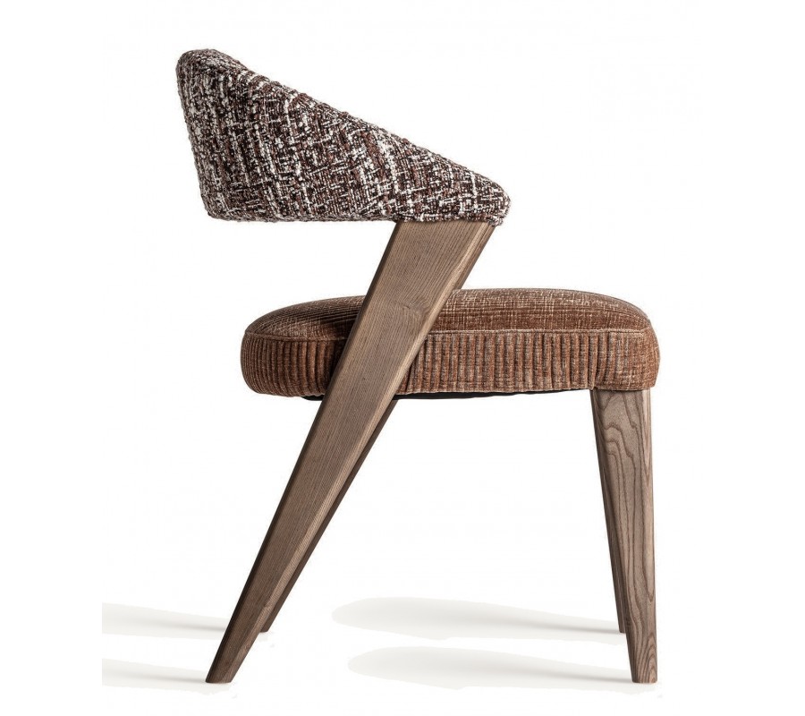 Jedálenská stolička Leni prináša do interiéru spojenie luxusného retro dizajnu a prírodných materiálov v dokonale vyváženom prevedení. Oblé operadlo v tvare U sa elegantne stáča okolo chrbta a plynulo prechádza do bočných opierok na ruky, ktoré poskytujú komfortnú oporu pri sedení. Pod nimi začínajú šikmé nožičky, ktoré podopierajú celú konštrukciu a zabezpečujú jej pevnosť a stabilitu.