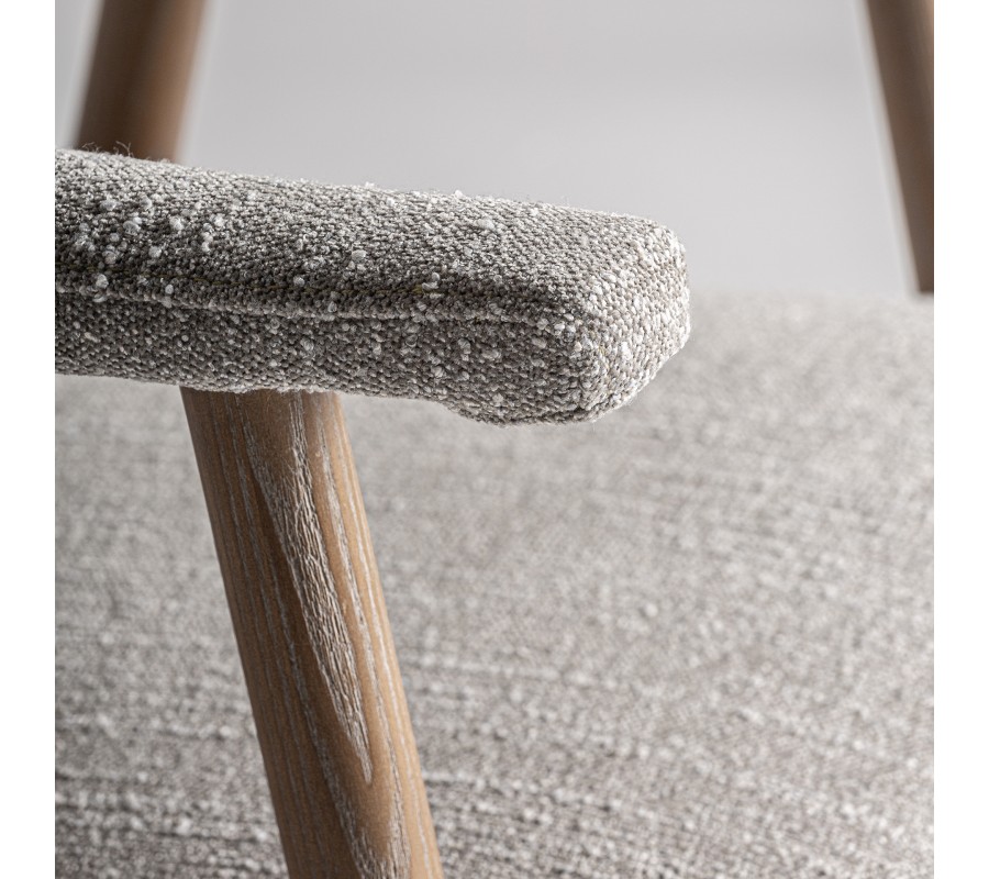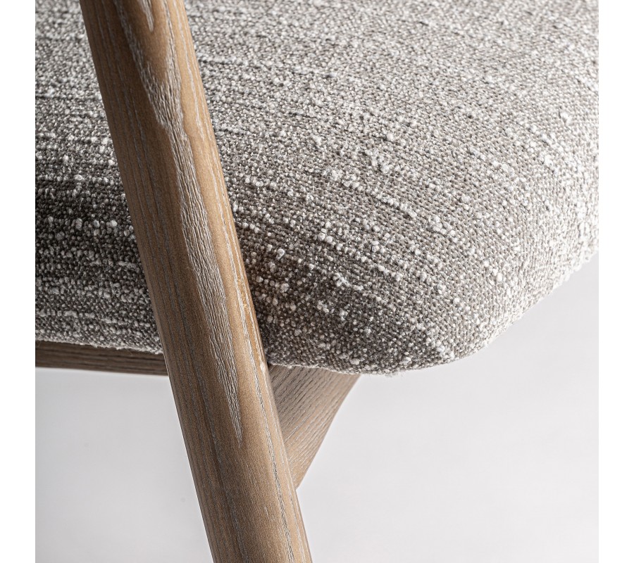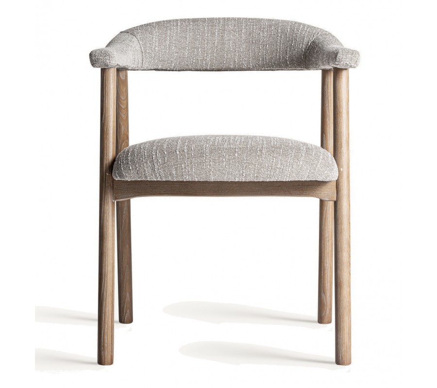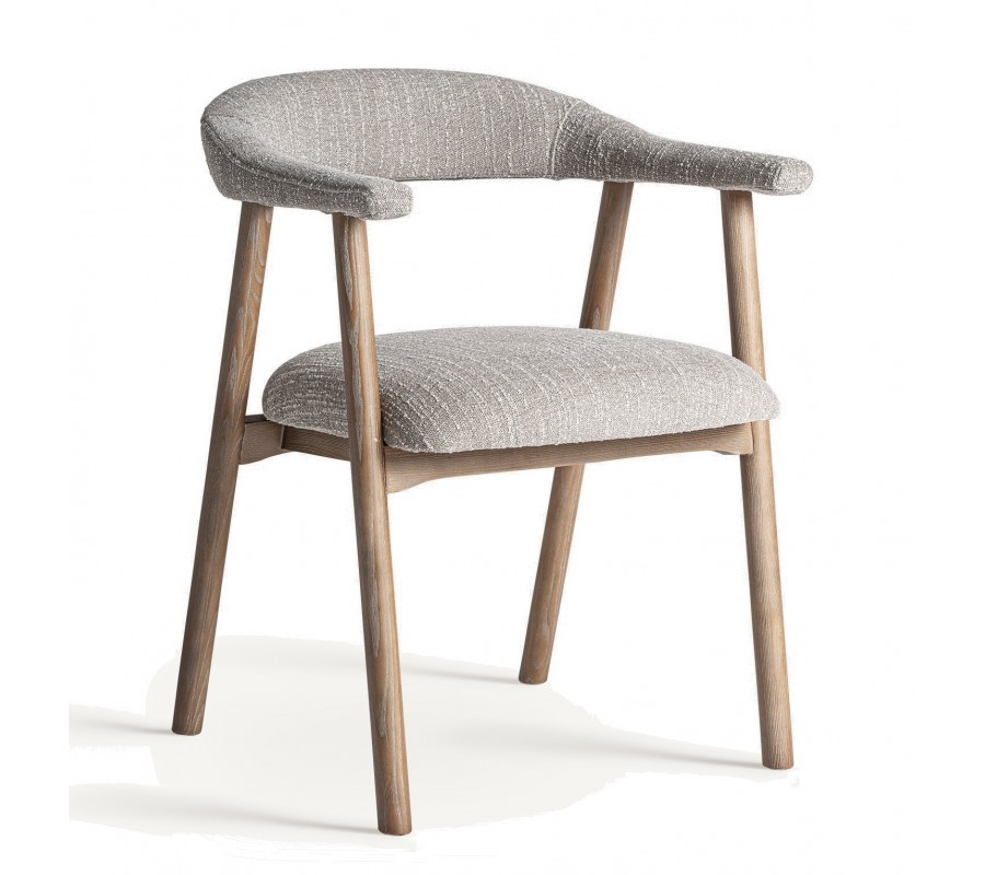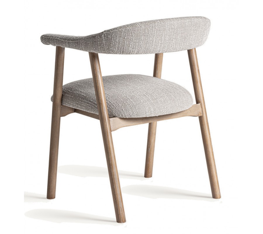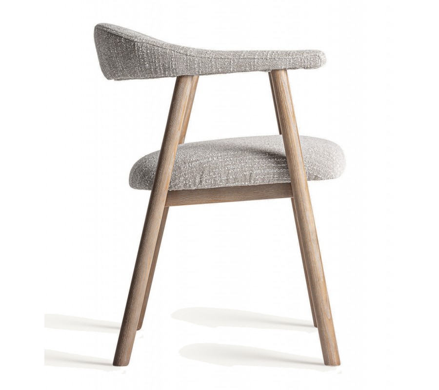 Dizajnovým prvkom, ktorý podčiarkuje sofistikovaný vzhľad tejto jedálenskej stoličky, je premenlivá línia operadla, ktoré plynulo prechádza do opierok na ruky. Táto konštrukcia nielen poskytuje dokonalú ergonómiu a oporu pri sedení, ale zároveň vytvára vizuálne ľahký a vzdušný dizajn. Bočné opierky sú priamo spojené s nožičkami, čím vzniká prirodzený tok drevených prvkov, ktorý je charakteristický pre kvalitné stolárske spracovanie.