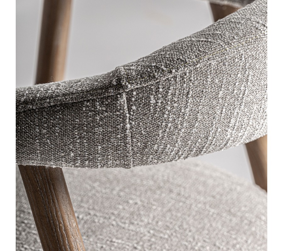 Čalúnené sedadlo aj operadlo sú potiahnuté kvalitnou textíliou v sivej farbe, ktorá je ozvláštnená jemným vyšívaným vzorom v podobe bielych čiarkových línií. Tento detail dodáva čalúneniu štýlový a remeselný charakter, pričom štruktúrovaný textilný povrch je príjemný na dotyk a zároveň odolný voči opotrebovaniu.