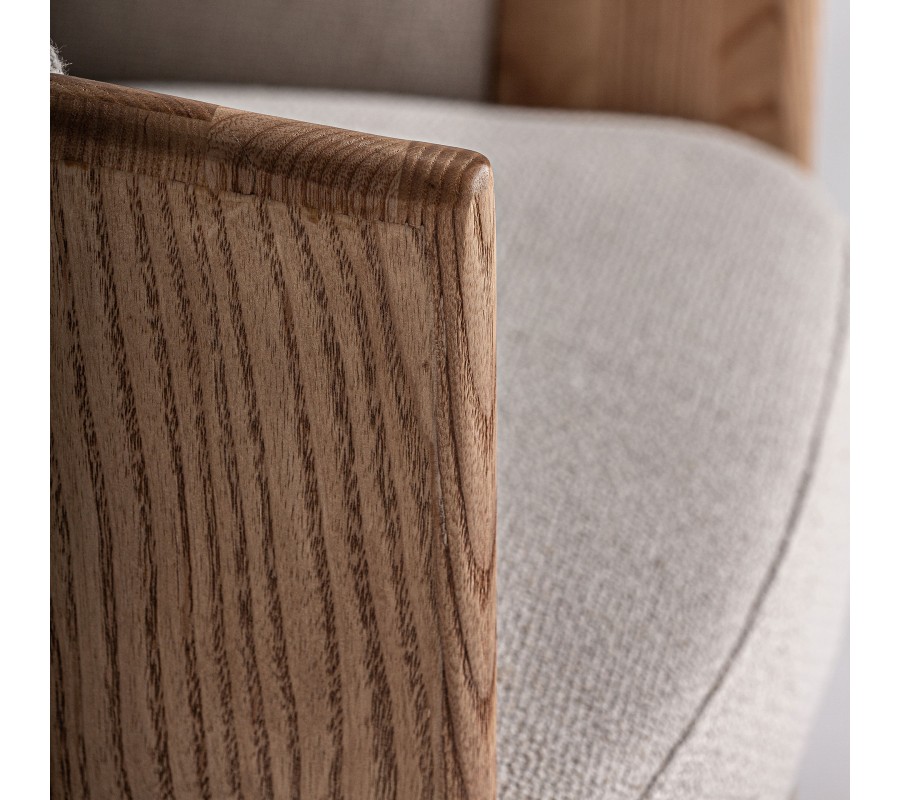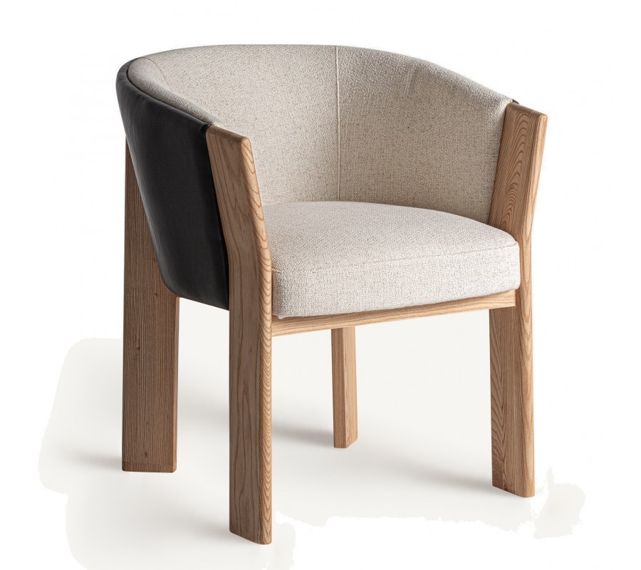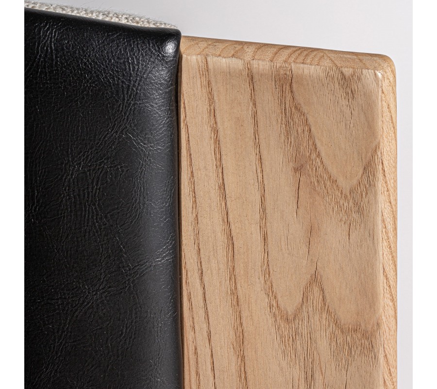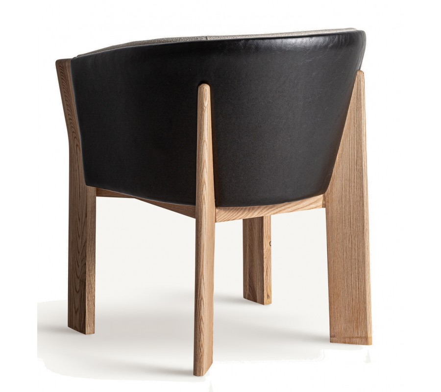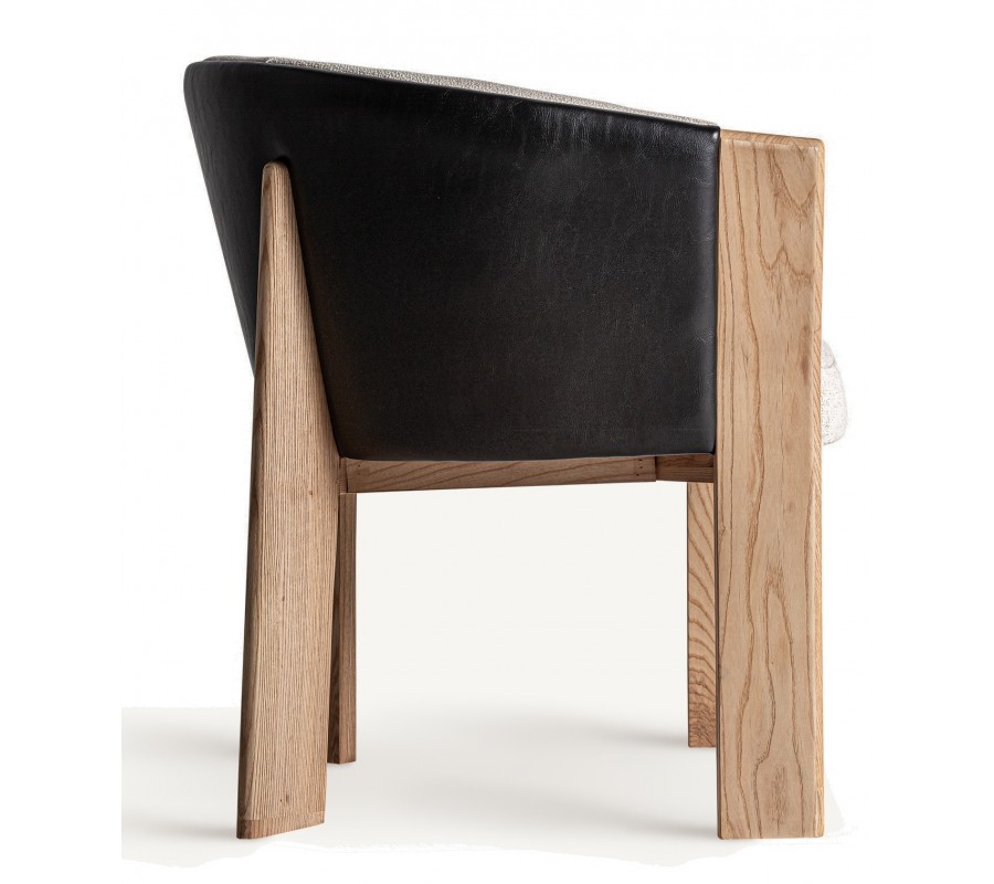 Konštrukcia z masívneho hnedého dubového dreva pozostáva zo štyroch plochých obdĺžnikových nožičiek, pričom zadný pár plynulo prechádza do opierky. Nožičky sú jemne zaoblené, čím dodávajú stoličke vizuálnu ľahkosť. Celkový dizajn pôsobí vzdušne a zároveň robustne, pričom kombinácia prírodného dreva, kože a látky prináša do miestnosti pocit útulnosti a luxusu.