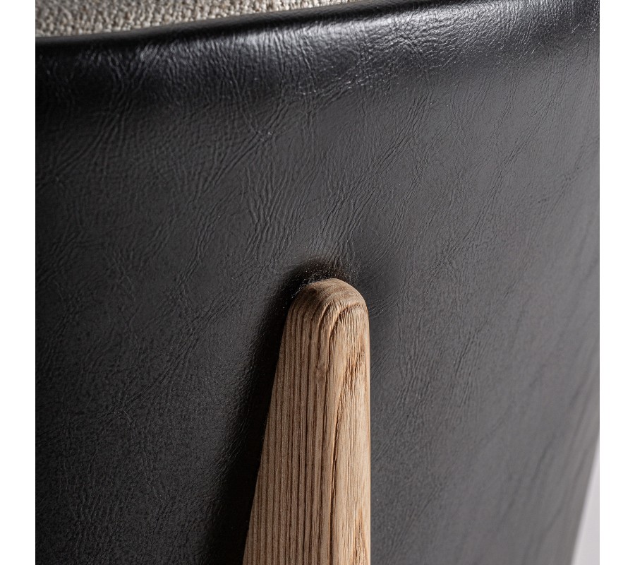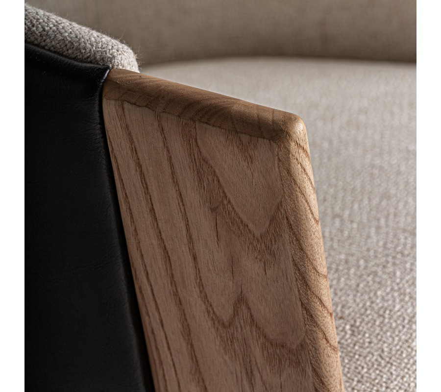 Opierka oblého tvaru je z vonkajšej strany čalúnená prírodnou kožou v kontrastnej čiernej farbe, pričom vnútorná časť, spolu so sedacím vankúšom je potiahnutá béžovou látkou s jemnou štruktúrou, čím vzniká vizuálne zaujímavý prechod medzi materiálmi.