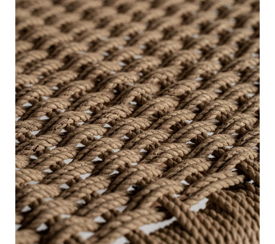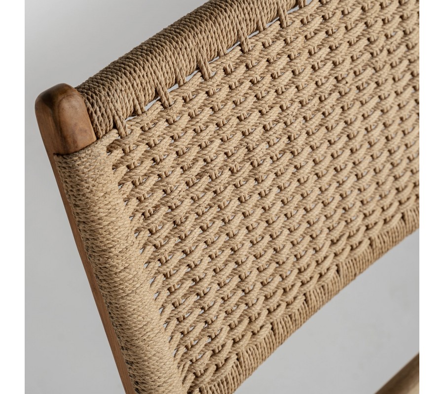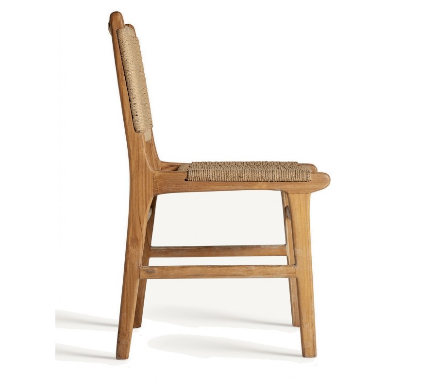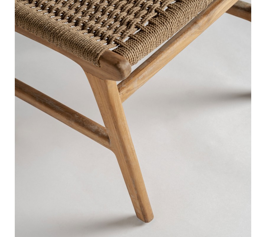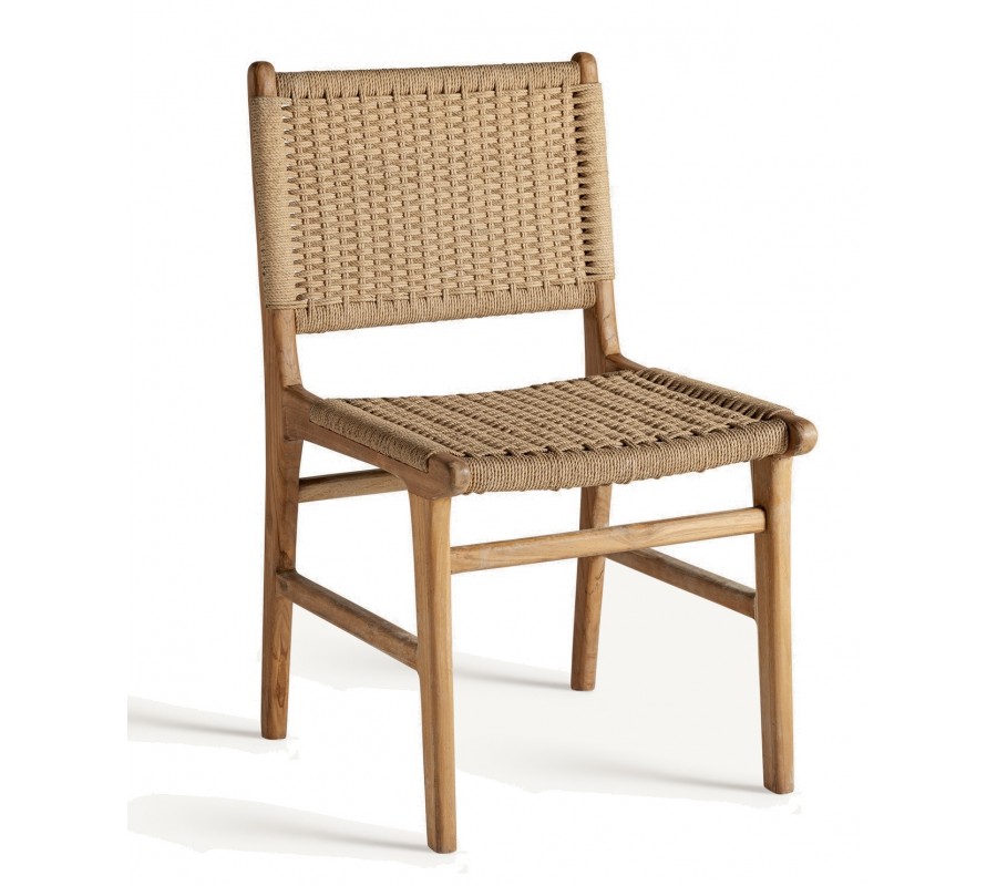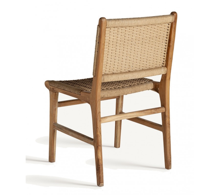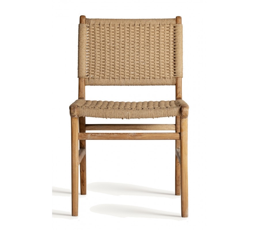 Rám stoličky je vyrobený z masívneho teakového dreva v teplej hnedej farbe s prirodzenou kresbou letokruhov. Exotické drevo prináša do dizajnu nádych koloniálneho štýlu a je tiež mimoriadne pevné a odolné. Sedadlo a chrbtová opierka majú výplet z prírodného vlákna v naturálnej hnedej farbe. Vzor pripomína pletené košíky a je pevný a priedušný zároveň. Prírodné vlákno výborne korešponduje s masívnym drevom a výplet dodáva stoličke estetiku etno štýlu.