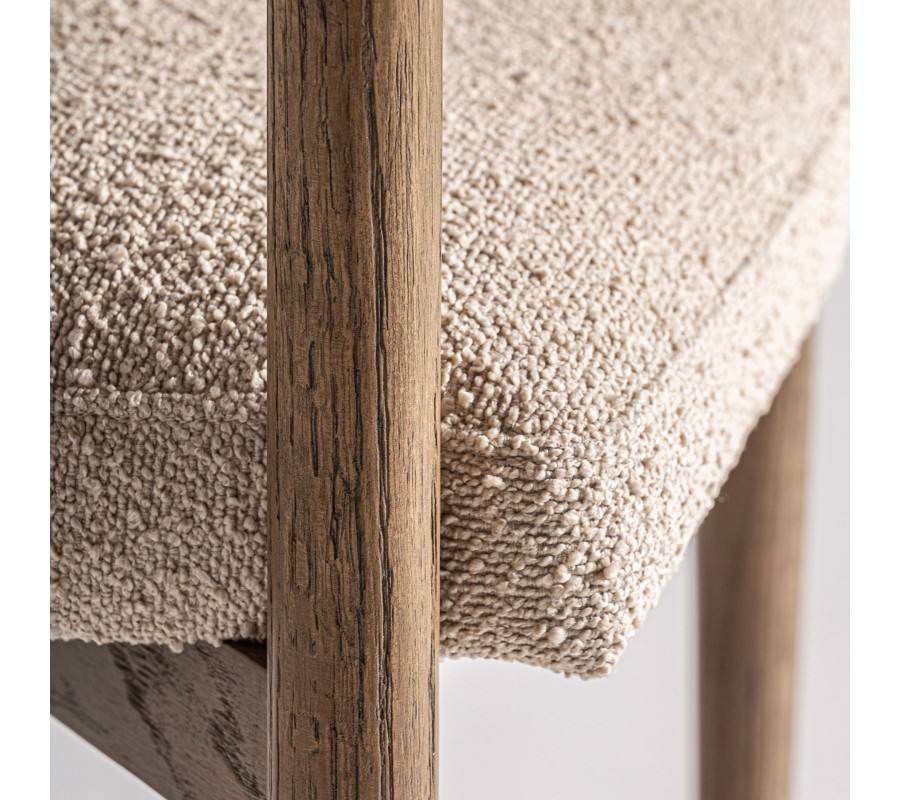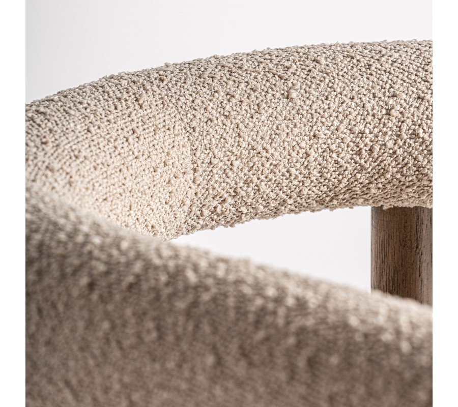Zaoblená sedacia časť je priestranná a pohodlná, čalúnená béžovou štruktúrovanou látkou, ktorá vytvára nápaditý vizuálny detail. Opierka je tvorená valcovým operadlom, ktoré plynule prechádza do dvoch bočných opierok.