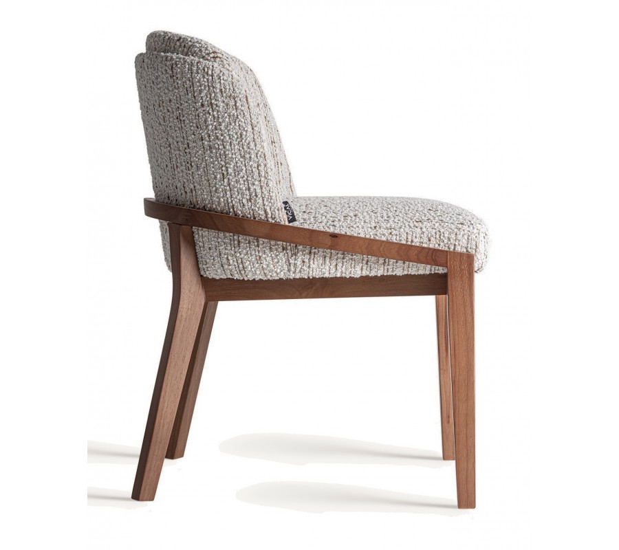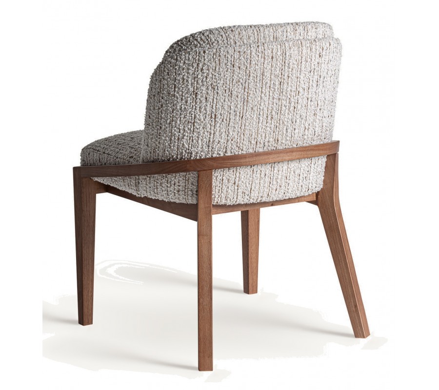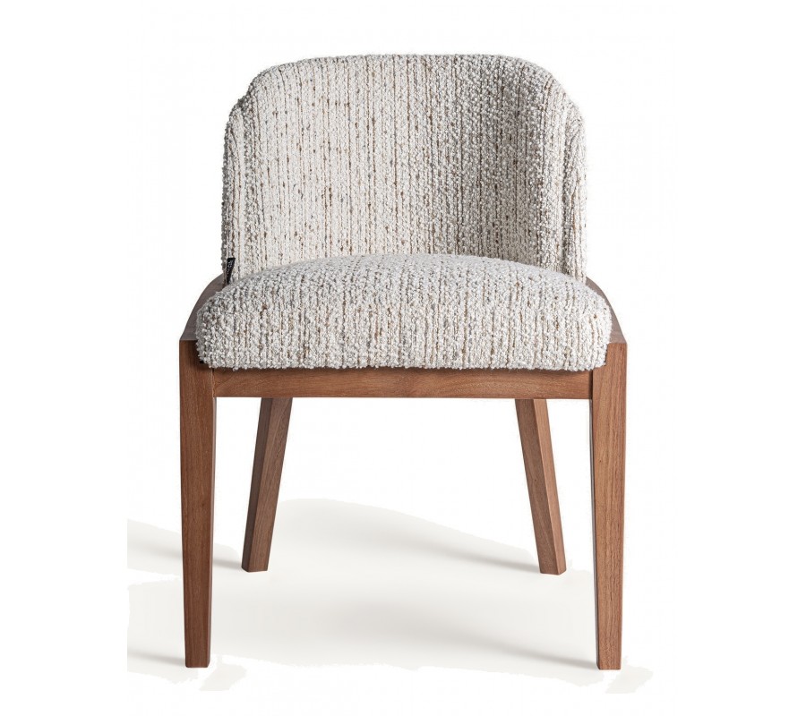 Sedák aj operadlo sú bohato čalúnené textúrovaným poťahom v bielej farbe, s jemne vystupujúcim reliéfom, ktorý pripomína ručne tkaný povrch. Opierka má oblé zakončenie v tvare písmena U, čo zaručuje pohodlie pri sedení aj pri dlhšom stolovaní. Materiály, najmä masívne drevo s výraznou kresbou letokruhov, podčiarkujú remeselnú kvalitu a prirodzený vzhľad.