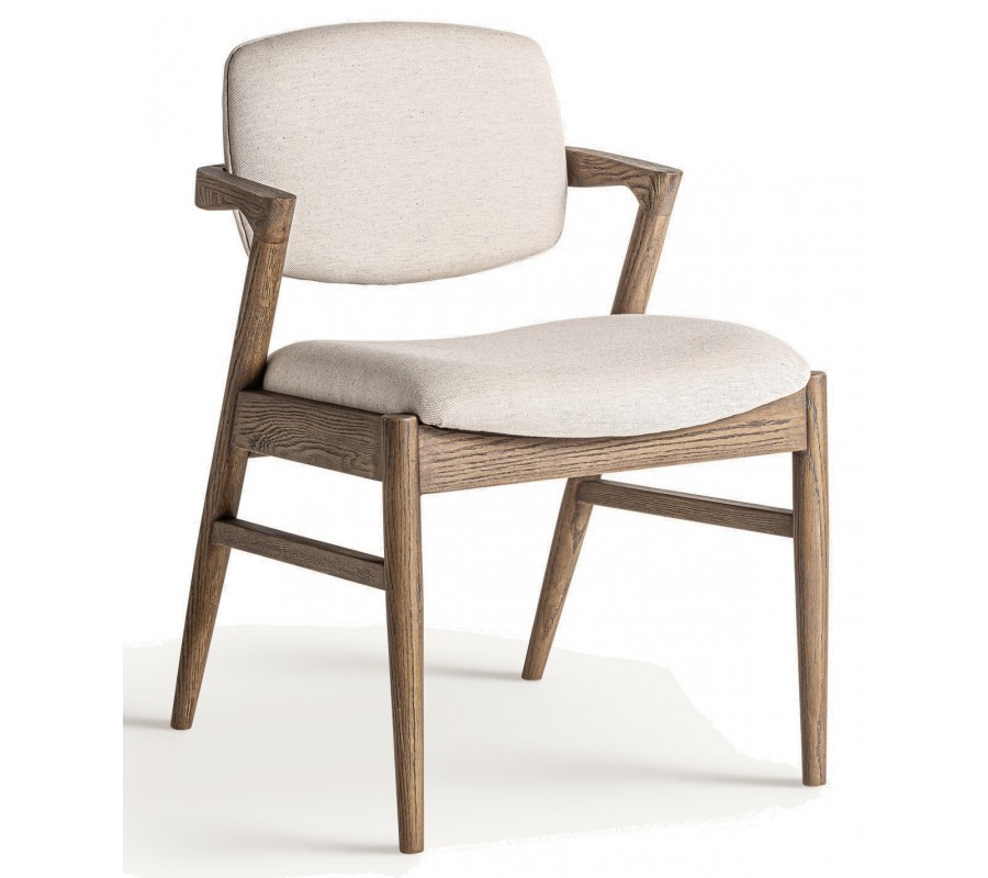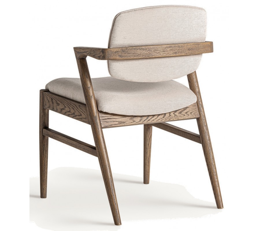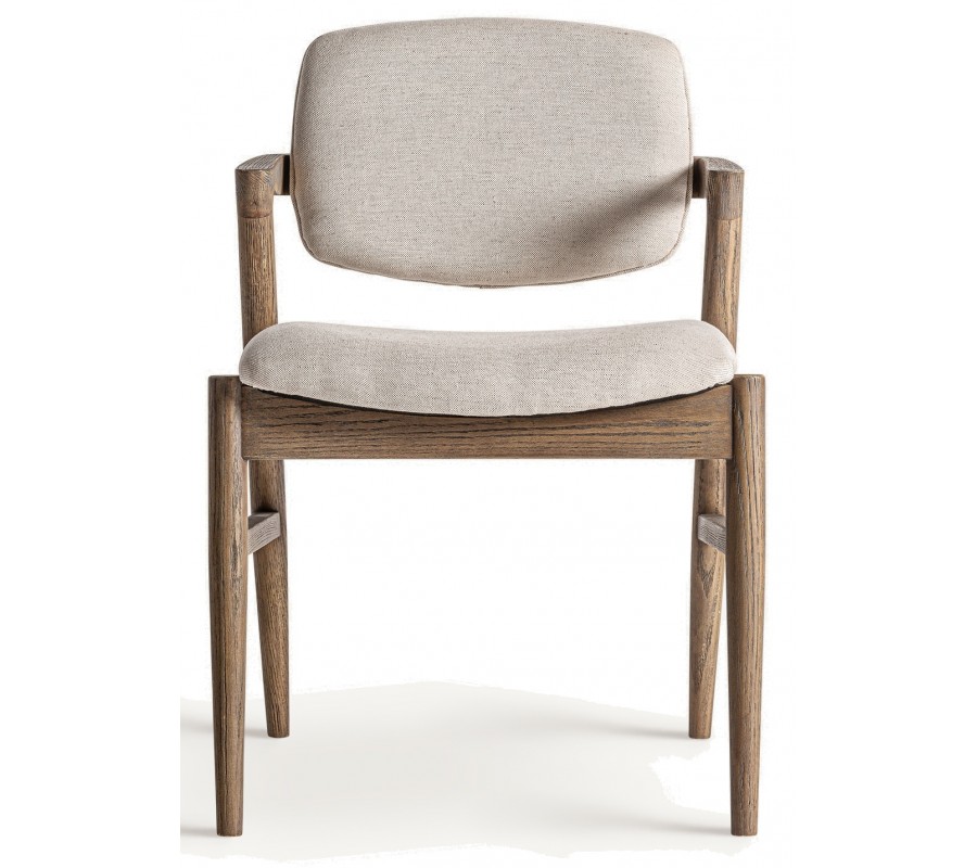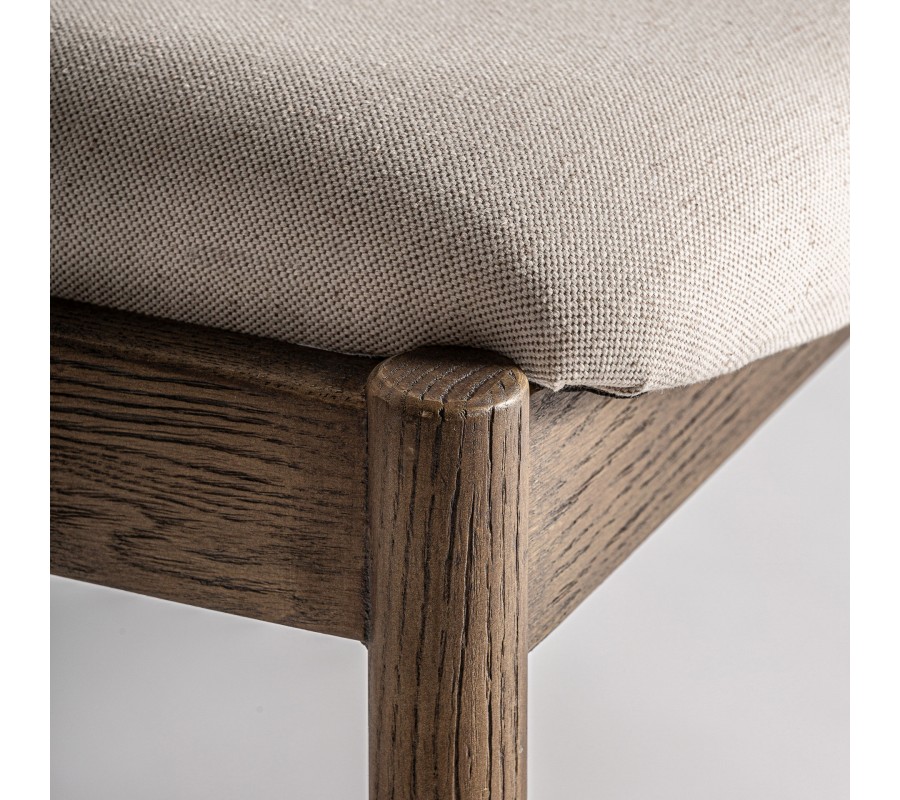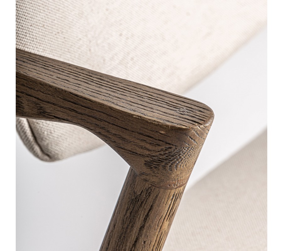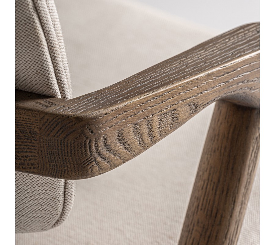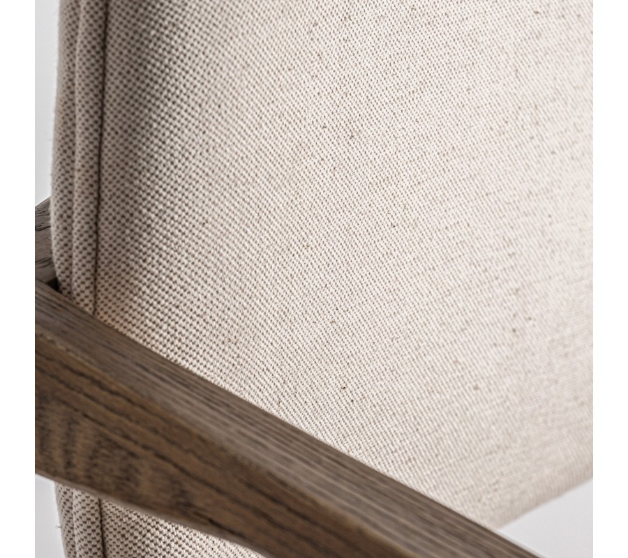 Sedák aj operadlo sú čalúnené príjemným béžovým ľanovým poťahom s jemnou textúrou, ktorý pôsobí vzdušne a zároveň elegantne. Stolička má malé opierky na ruky, ktoré sú ergonomicky tvarované a prepojené s operadlom, čím vytvárajú subtilný, ale funkčný oporný prvok. Zadné nožičky sú mierne zošikmené, čo dodáva celkovej siluete dynamiku a zároveň stabilitu.