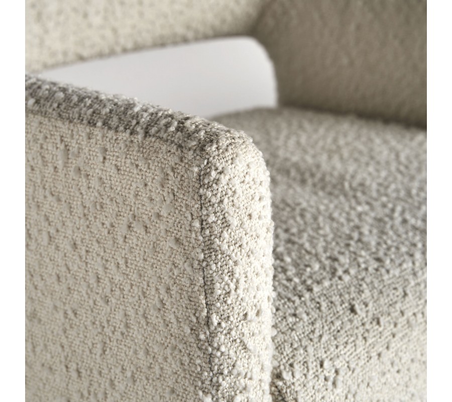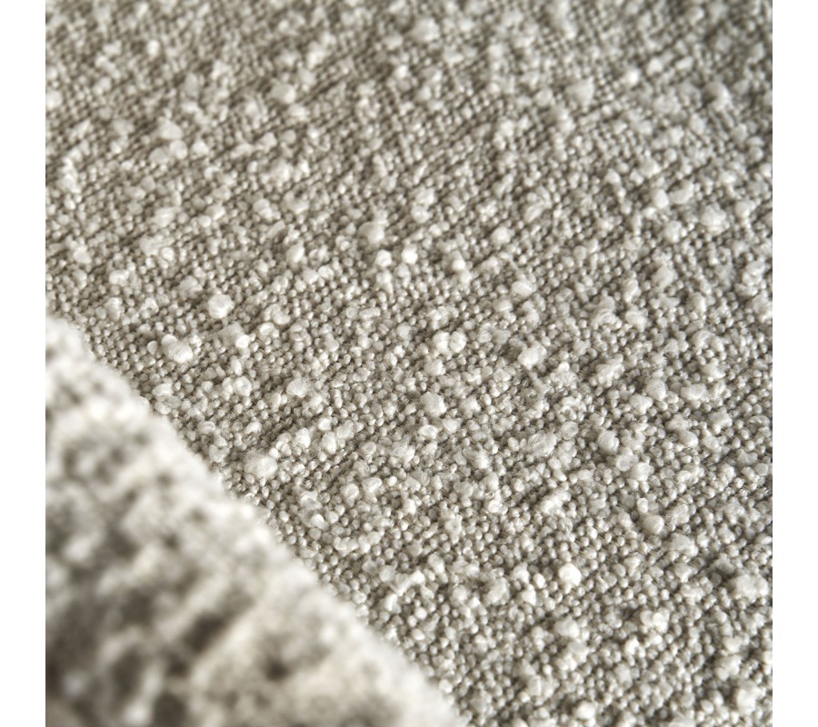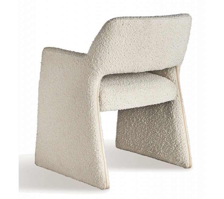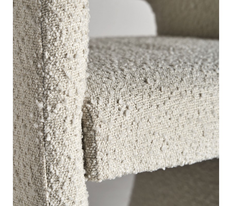 Jedálenská stolička má pevnú drevenú konštrukciu, obalenú penovou výplňou, ktorá zaručuje pohodlné sedenie aj počas dlhšieho času. Poťah je vyrobený z bavlny a buklé látka svojou výraznou štruktúrou nábytok oživí. Biela farba v odtieni off-white s jemnou prímesou béžovej pôsobí naturálne a vďaka kombinácii s na dotyk príjemnou buklé textúrou a mäkkým čalúnením tak stolička pôsobí teplým a útulným dojmom.
