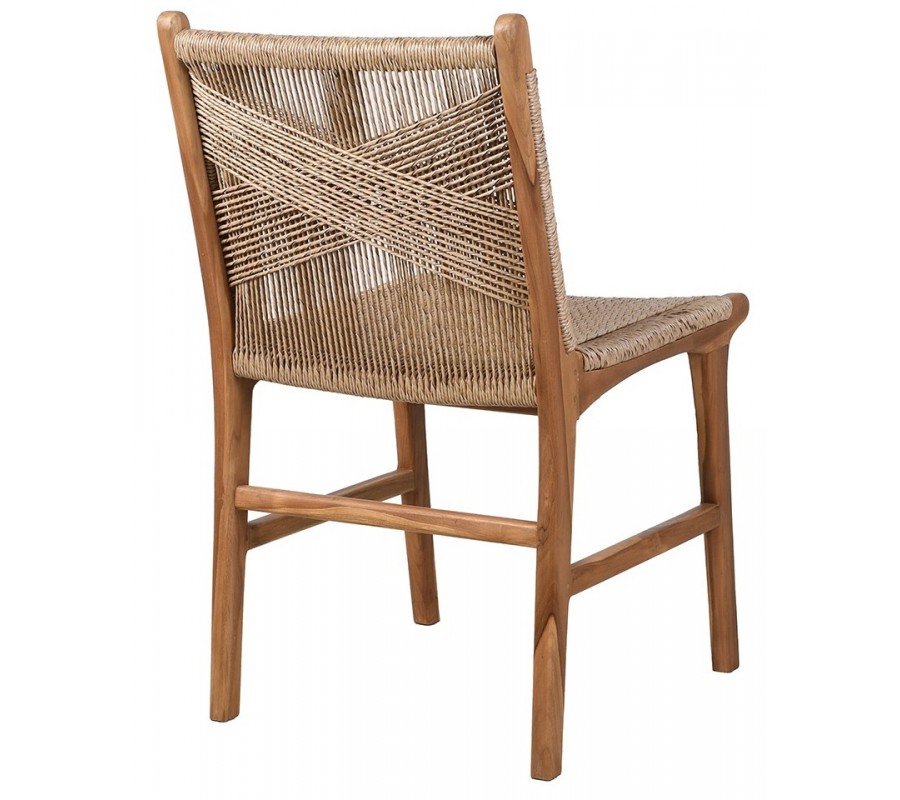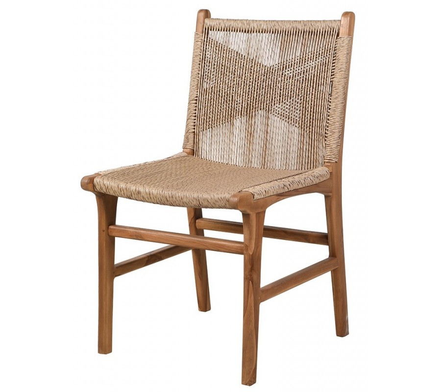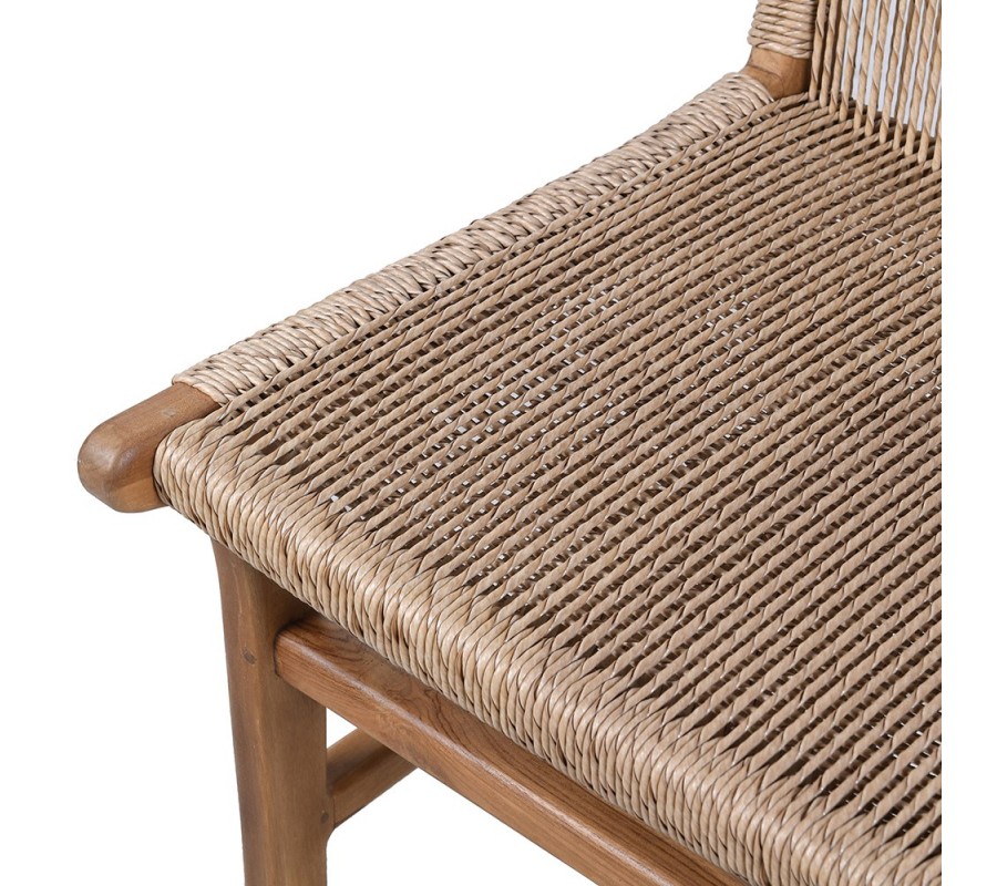Dizajnová vidiecka jedálenská stolička Juria predstavuje harmonické spojenie prírodných materiálov a remeselného spracovania. Vyrobená je z masívneho teakového dreva v teplej hnedej farbe, ktoré je známe svojou pevnosťou, dlhou životnosťou a nádhernou kresbou. Sedadlo aj operadlo sú doplnené výpletom z morskej trávy, ktorý pôsobí autenticky a prirodzene. Zaujímavým detailom je prekrižovaný výplet v zadnej časti operadla, ktorý dodáva vizuálnu dynamiku a remeselný charakter.