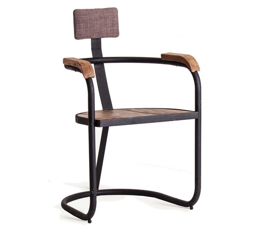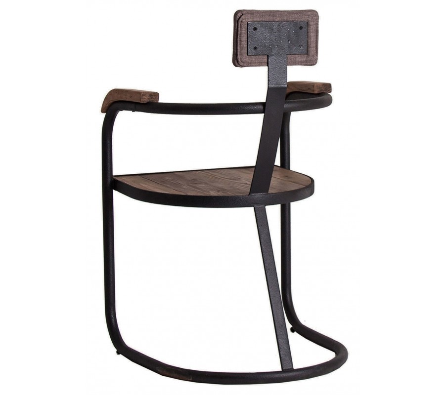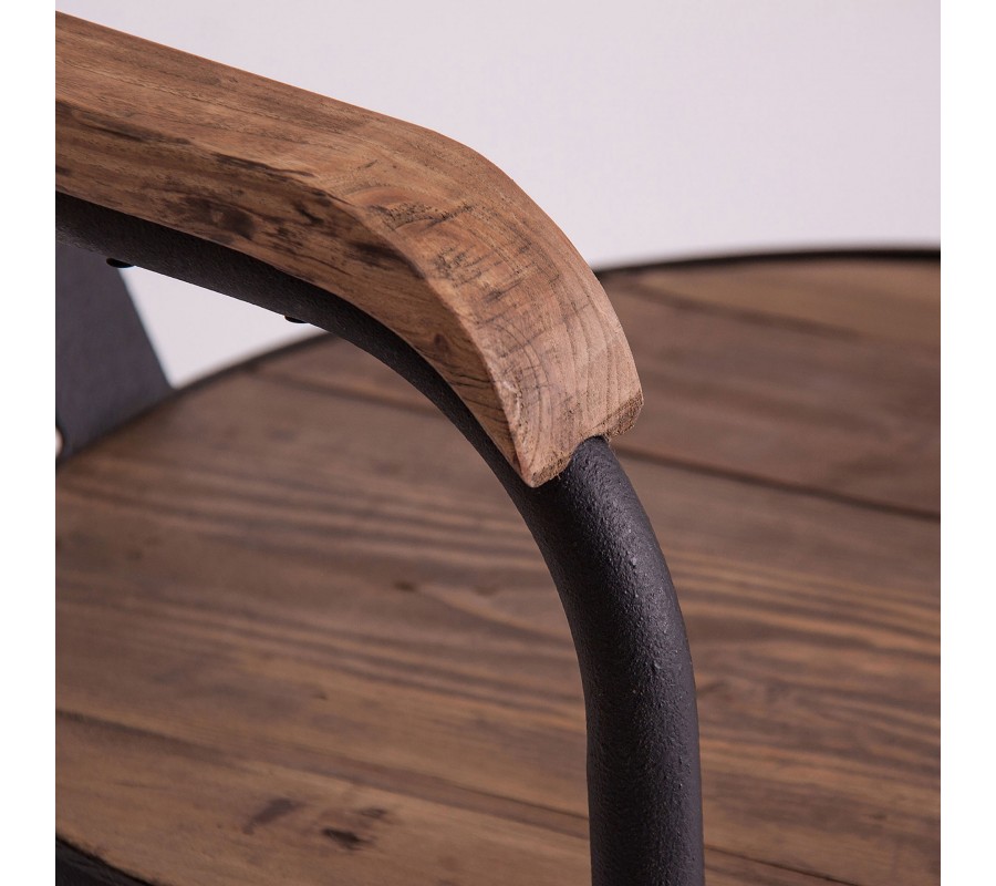 Sedadlo pozostáva z masívnych drevených dosiek v hnedom odtieni s viditeľnou štruktúrou letokruhov, čo zdôrazňuje naturálny charakter materiálu. Opierky na ruky sú vytvarované z rovnakého dreva, jemne zaoblené a ergonomicky usadené na kovovej konštrukcii, čo poskytuje pohodlie aj štýlový kontrast medzi teplým prírodným tónom a chladným kovom.