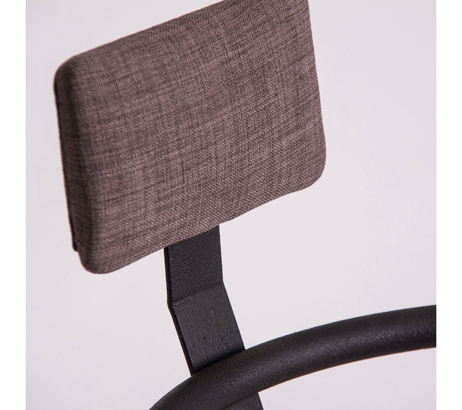 Opierka chrbta je čalúnená tkaninou v jemnej hnedej farbe a uchytená na tenkom kovovom ramene, ktoré ju spája s konštrukciou stoličky. Tento detail pôsobí minimalisticky a odľahčuje celkový dizajn.
