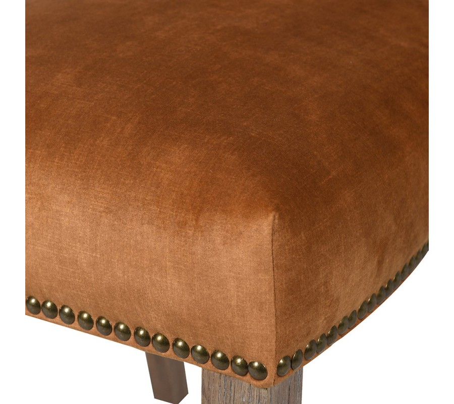 Jej jemne zaoblené operadlo zaisťuje pohodlné opretie chrbtovej časti, pričom tvar nadväzuje na prirodzené línie chrbta a poskytuje potrebnú ergonómiu pre dlhšie sedenie. Poťah so zamatovým leskom v teplej hnedo-oranžovej farbe dodáva nábytku luxusný nádych a v kombinácii s kontrastnými mosadznými nitmi, ktoré zdobia spodnú hranu sedacej časti a lemujú boky operadla, vytvára dojem exkluzivity a starostlivého spracovania.