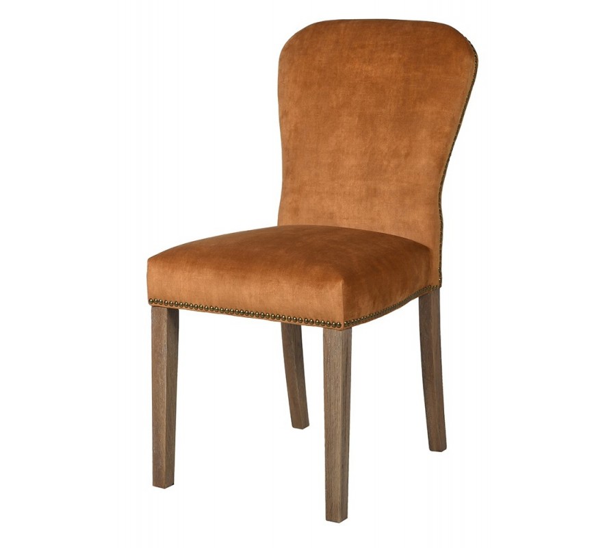 Štýlová koloniálna čalúnená jedálenská stolička Zorana so zamatovým hnedo oranžovým poťahom a hnedými masívnymi nožičkami 92 cm