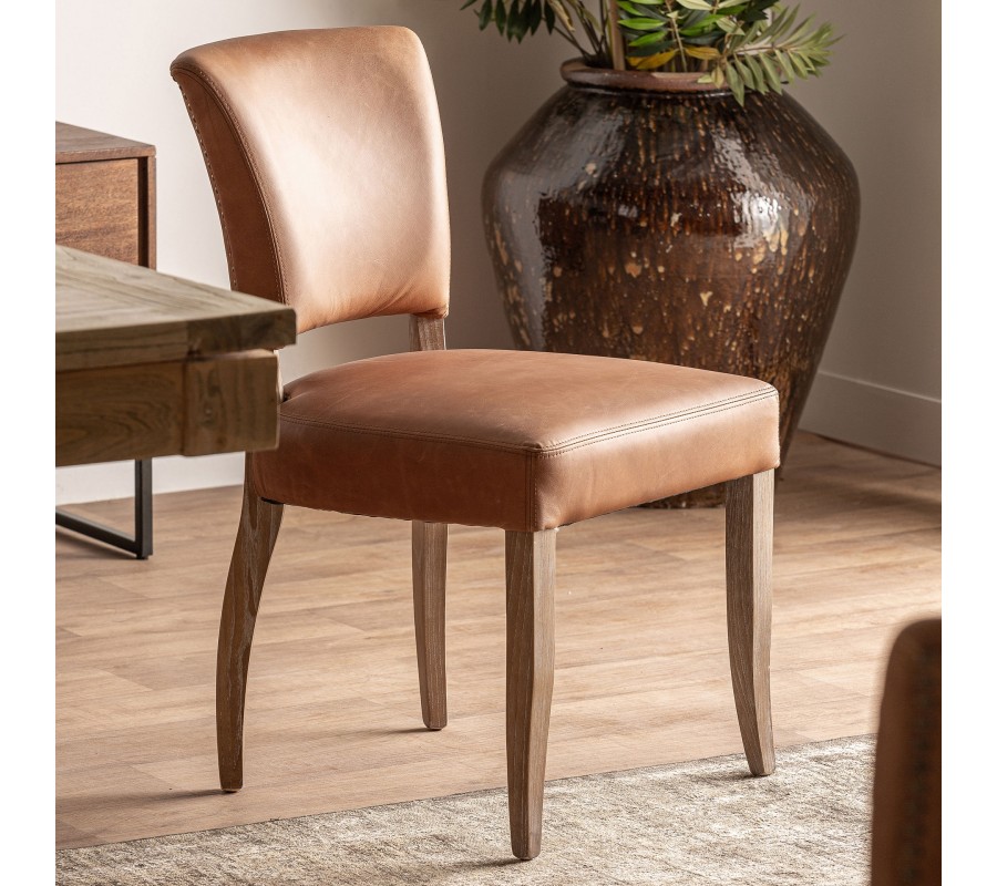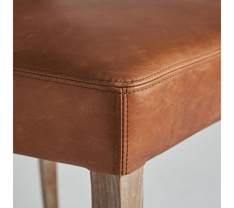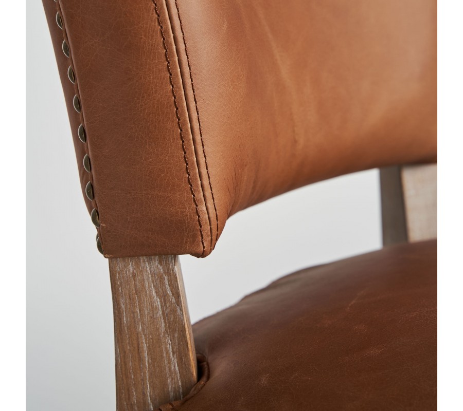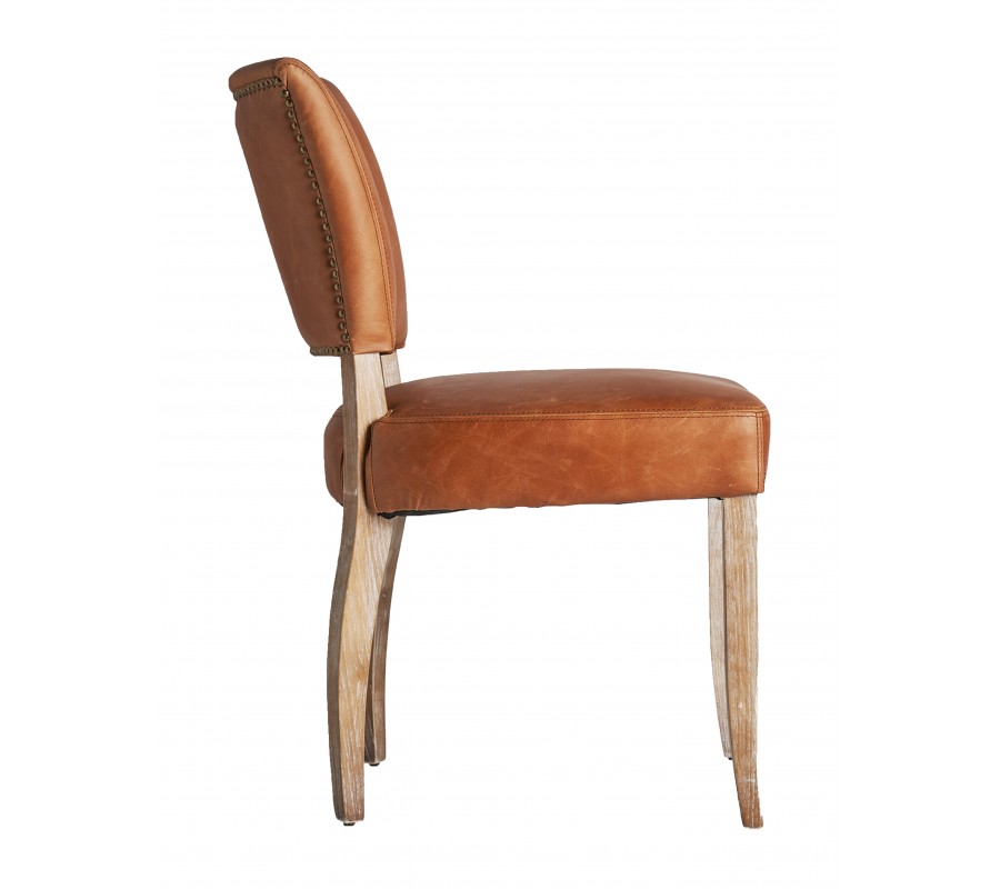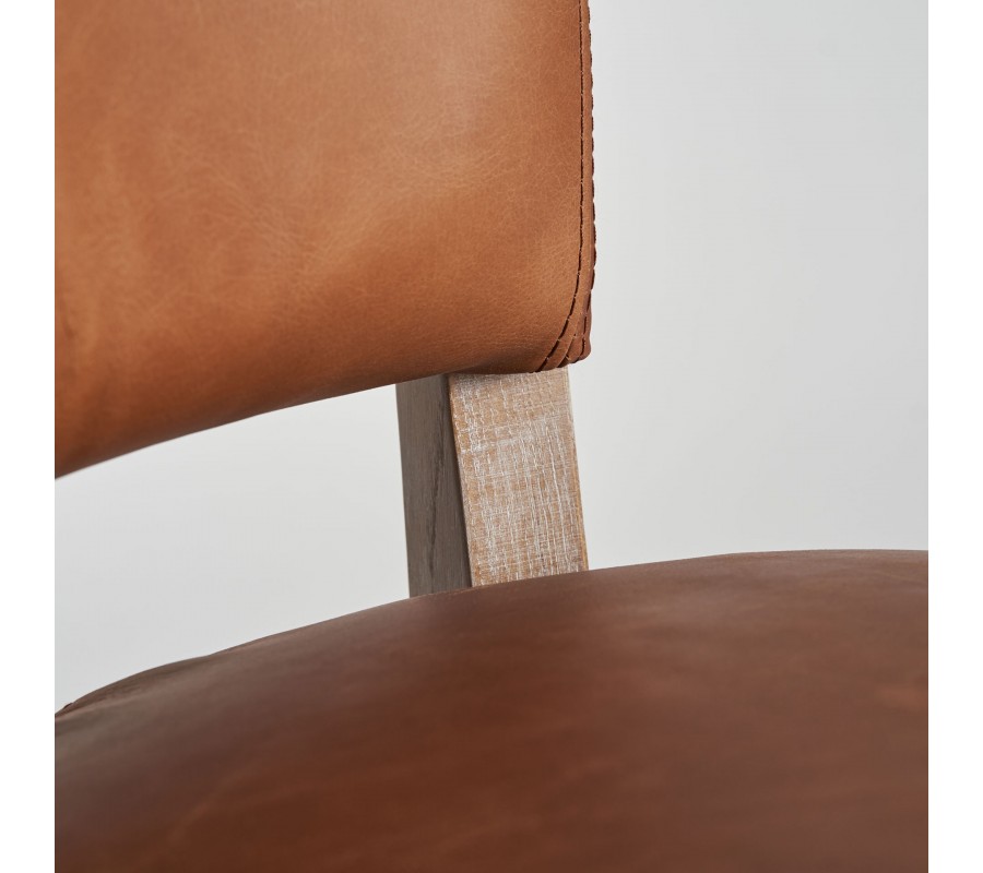 Luxusná jedálenská stolička Missal v sebe spája autentickú prírodnú krásu a remeselnú precíznosť, čím vyniká ako štýlový prvok vo vintage alebo koloniálne ladených interiéroch. Sedacia časť a operadlo sú bohato čalúnené a potiahnuté pravou kožou v teplom hnedom odtieni s jemnou textúrou a prirodzenými vráskami, ktoré zvýrazňujú exkluzivitu materiálu. Opierka na chrbát je mierne zaoblená a smerom nahor sa jemne rozširuje, čo poskytuje komfort aj estetickú ľahkosť.